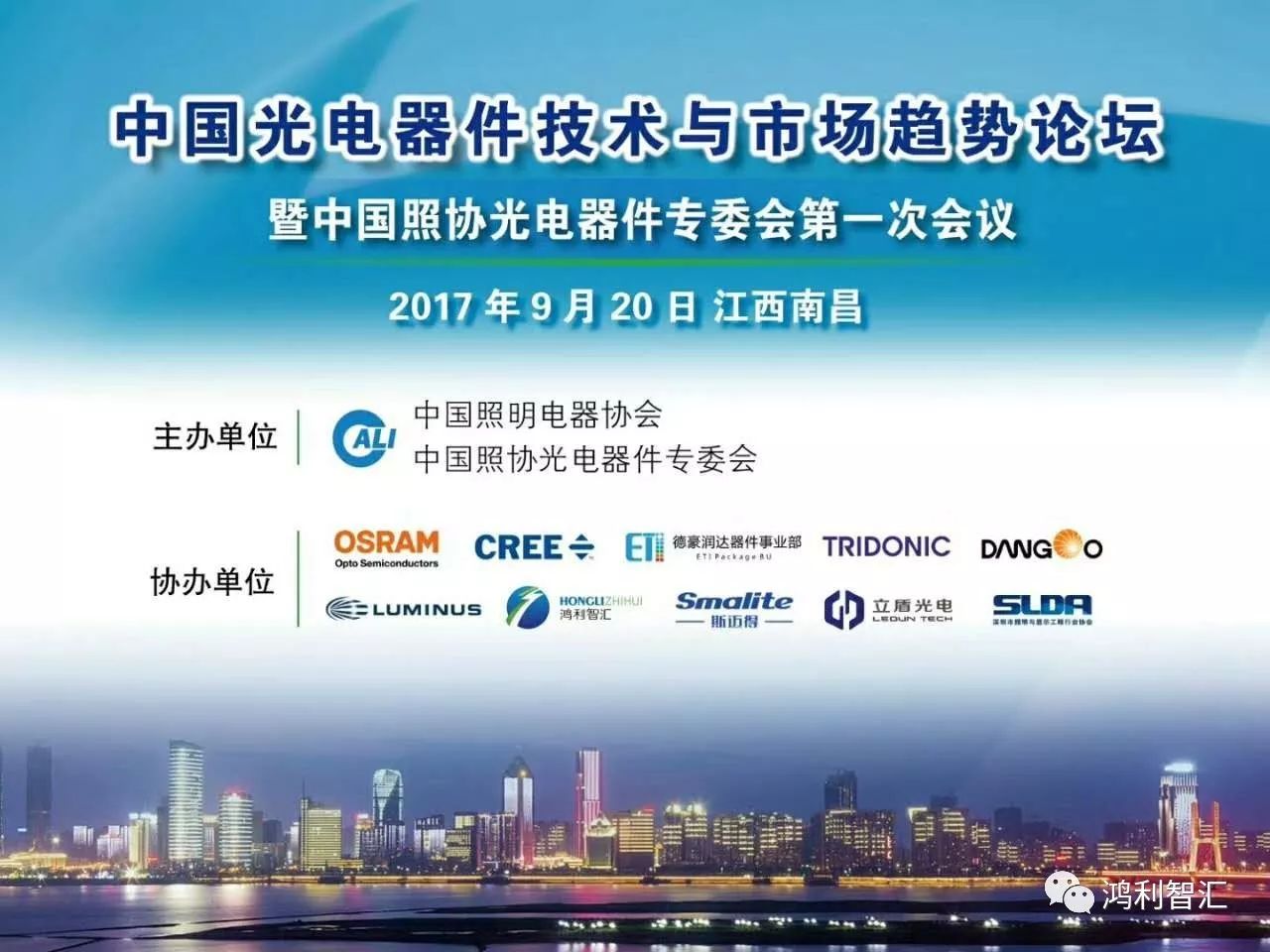 9月20日下午 ,在“2017年全国照明产业供应链大会”举办期间,同期召开了由中国照明电器协会主办的“中国光电器件技术与市场趋势论坛暨中国照协光电器件专委会第一次会议”。会议在南昌凯美开元名都大酒店一楼隆重举行,鸿利智汇集团股份有限公司作为协办单位参加了会议。