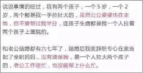 她自述,和老公结婚六七年了,婚后专心做全职妈妈,一个人拉扯大了两个孩子。