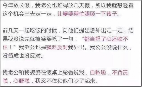 眼看着国庆就要到了,想让婆婆帮忙带几天孩子,自己出去放松几天,却被老公和婆婆轮番diss:“都当妈了还收不住心!”