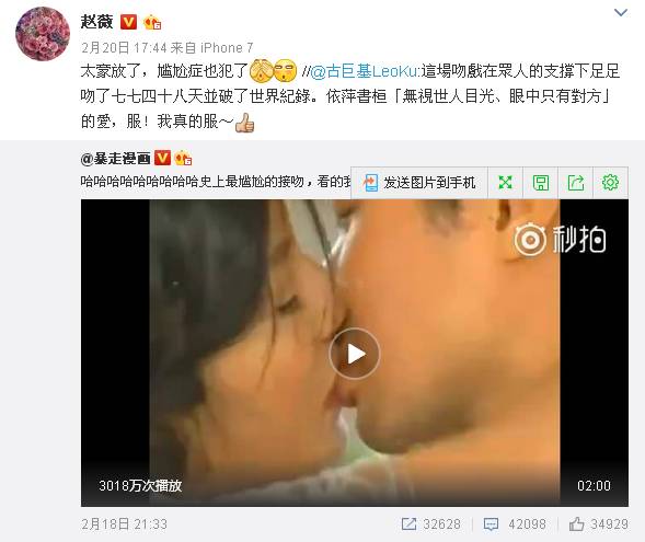 随后赵薇转发古巨基的微博时评论:“太豪放了,尴尬症也犯了”