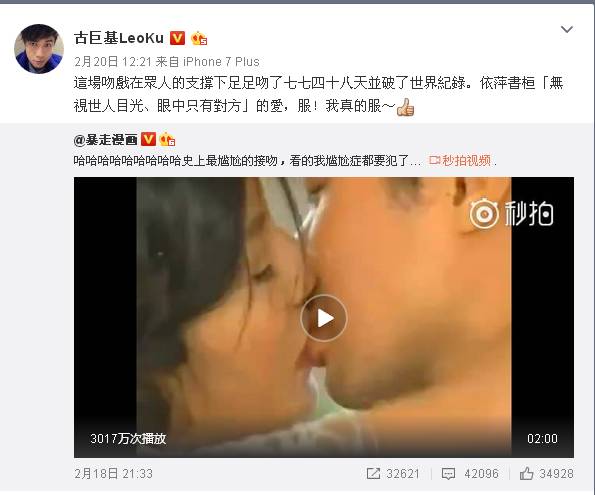 古巨基在昨天下午转发了此条微博还评论到:“这场吻戏在众人的支撑下吻了七七四十八天并破了世界纪录。依萍书桓无视世人眼光、眼里只有对方的爱,服!我真的服~”
