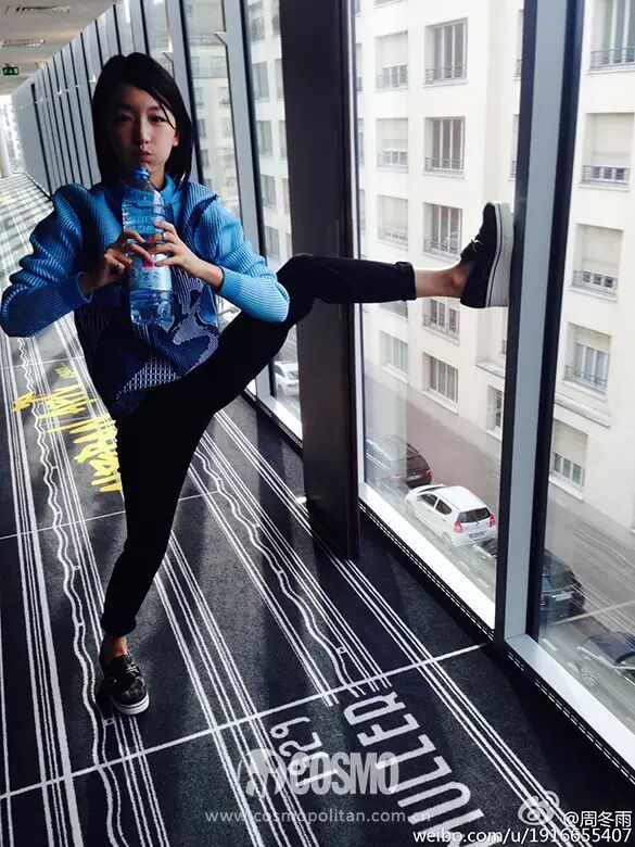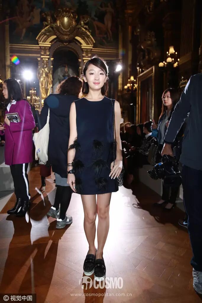 ▲2015巴黎时装周周冬雨现身Stella Mccartney秀场,羽毛装饰的连衣裙搭配厚底鞋,轻熟有型。