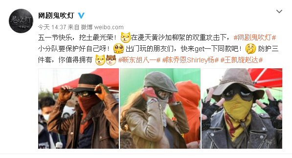 不过不要看防护三件套表面上很拉风,今天帝都室外温度可是高达30度呢!想想这样的高温下,摸金三人组还捂得这么严实,是不是瞬间更心疼了呢?哥哥和大家拍戏时也要注意防暑降温啊!