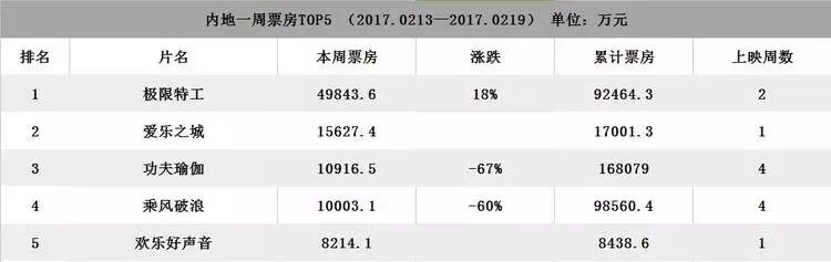 2、上周周大盘总体达到11.9亿,上周日均票房1.98亿,周六、周日两天分别达到1.98亿和1.6亿。其中《极限特工:终极回归》以4.98亿实现上映10天10连冠,占据上周票房榜第一名,票房占比41.6%。《爱乐之城》以1.56亿排名第二,票房占比13%,《功夫瑜伽》以1.09亿紧随其后。