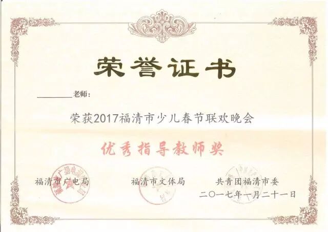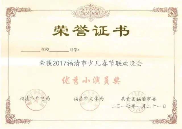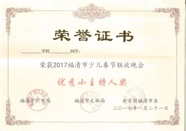 2017福清少儿春节联欢晚会证书亮相