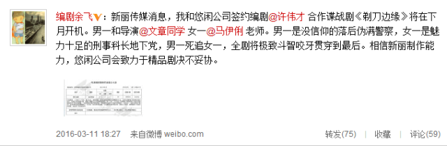 谍战剧《剃刀边缘》将于下个月开机,文章担任导演和男主,马伊琍再度出演女一号;文章饰演的角色一个没有信仰的落后伪满警察,马伊琍则饰演魅力十足的刑事科长地下党;重点来了,剧中文章死追马伊琍,全剧将贯穿斗智咬牙。