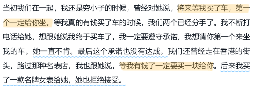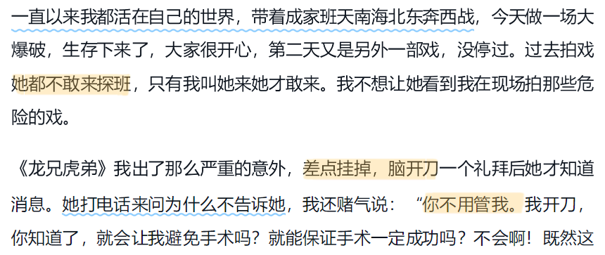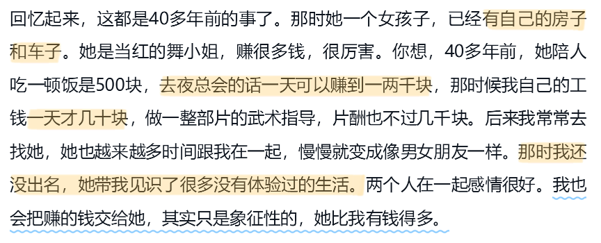 成龙的瓜,太大了! 周冲的影像声色 港台男星 2023-06-11 20:28:40 359 创作不易,用心坚持,欢迎请BaGua喝几杯爱心咖啡!打赏并支持本文 打赏并删除本文 光环之下,那个真实的人到底是谁,少有人知。1981年,成龙接到一个电话。电话那头是王安妮,《银色世界》杂志编辑。“我拍了些照片,要不要来看看?”成龙去了。 走进门,看到王安妮正和一个女孩聊天。 女孩儿脸蛋圆润。 笑起来眼眸像卧着星星。 成龙心里暗暗“哇”了一声。 “这个女孩长得好纯,有惊为天人的感觉。” 一问才知道,她是演员林凤娇。 彼时林凤娇正当红。 人人都说,她美貌和演技并存。 她与林青霞、胡慧中、胡因梦,齐称“台湾四美”。 斩获金马奖影后,和林青霞、秦汉、秦祥林并称为“二林二秦”。 林凤娇(左)和林青霞 林凤娇笑着和成龙打招呼。 她还不知道,不久后她将栽在这个愣头愣脑的小伙子身上。 那时她是无数人的梦中情人。 李敖曾感慨,“台湾有10万个男人想娶林凤娇为妻”。 而当时成龙身边,也围着众多莺莺燕燕。 万花丛中过,片叶不沾身。 他也没想到,日后会和这个女孩产生几十年的纠葛。 成龙风流一世。 睡过妓女,陪过舞女,恋过女神邓丽君…… 他也不隐瞒否认。 2015年,他出版自传《还没长大就老了》。 真实记录了生命中的那些花儿。 透过成龙朴素的笔墨,我们能看到—— 大哥的武打江湖很热血。 大哥的半生情史也够精彩。 听说初恋是男人永远的白月光。 成龙也不能免俗。 那年他15岁,女友16岁。 是拉拉小手都会脸红心跳的年纪。 那时的他们,单纯而简单。 父母反对,他们就偷偷溜到公园。 肩并肩坐在长椅上,一坐就是五六个小时。 成龙有时候把手搭在女友肩膀。 手麻了也不敢拿下来。 后来成龙有了自己的小房子。 女友就每天到他家,替他洗衣服、收拾房间。 再后来,成龙心性越来越野。 他开始躲着女友。 推说“很忙”,跑去跟狐朋狗友混在一起。 女友是当红花旦,很漂亮,很多有钱人追。她都拒绝了。 她一直守在穷小子成龙身边。 “你不娶,我不嫁。” 可惜成龙满眼花花世界,还不懂珍惜。 终于有一天,他们分手了。 他彻底失去了她。 后来成龙极力弥补。 他说我买车了,我答应过让你第一个坐我买的车。 女友拒绝。 他送去一块表,说我承诺过给你买名牌表。 女友不接受。 图源:自传《还没长大就老了》,下同 想送一栋房子。 女友也不要。 她开了一家服装店。 成龙暗中派人去关顾生意。 女友知道后把店关了。 她是一个特别有骨气的女孩。 至今未婚。 成龙也至今未忘。 与初恋女友分手后,成龙走进了红灯区。 当时他十六七岁。 开始做武行。 干这行就是拿命来博。 他们随时可能看不到第二天的太阳。 成龙想,那还存什么钱啊。 不如今朝有酒今朝醉。 每天收工后,成龙就跟师兄们去夜总会。 他莫名专一。 每次都点九号女孩。 大家都开玩笑叫他“九号的男朋友”。 夜总会的条件很糟糕。 局促的格子间,天花板很矮,灯光很暗。 隔音也差,嘈杂不堪。 成龙却觉得那里是天堂。 那时他在剧组跑龙套。 每天就练功、拍戏,也不知道自己能不能红。 日子很苦很累。 而九号女孩,给了他极大慰藉。 有一次,成龙在港式茶餐厅吃饭。 有个女孩和他打招呼。 还一直盯着他看。 他觉得很奇怪。 我又不认识你,这是干嘛呢? 那天晚上,他照例去找九号。 一碰面她就问:“今天你为什么不理我?” 成龙愣住了。随即恍然大悟。 他们每次见面都是在夜晚昏暗灯光下。 从来没有在明亮的阳光下相见。 难怪认不出来。 那时他想,我们总归不能一直这样。 这段故事没有后续。 生于暗处的情愫,脆弱而松散。 慢慢也就无疾而终了。 18岁,成龙在香港做武术指导。 到了晚上,他喜欢跟兄弟们去些高级交际场所。 那里有许多舞小姐。 漂亮,有气质,修养好,受过高等教育。 这帮武行大老粗们,都喜欢和她们待在一起。 成龙就是在那里认识了Latisha。 脸上有疤痕。但还是很美艳。 她知书达理,英文讲得很好。 吃饭时,会把鸡骨头摆得整整齐齐。 成龙爱穿白色衣服。 Latisha就叫他“白衣人”。 那时成龙还没出名。 每天工钱也就几十块。 但Latisha一天能赚一两千块。 还有自己的房子车子。 两人感情很好。 Latisha带成龙见识了许多新奇的东西。 成龙把钱都交给了她。 成龙父亲听说后,强烈反对。 他告诫成龙:“千万不要跟舞女恋爱,会被骗钱的。” 听得多了,成龙也忍不住担心。 他去找Latisha。 Latisha一句话都没说。 她从抽屉里拿出一个薄薄的本子。 里面夹着成龙交给她的钱。 她分文未动。 全部还给成龙。 这一幕,成龙记了很久。 其实当时他只是个穷小子,Latisha这么有钱的舞女,能图他什么呢? 可惜后来他才懂。 再次见到Latisha时,她已结婚生子。 她依然漂亮,有气质。 看到她过得好,成龙放心了许多。 时间又过了几个春秋。 1979年,成龙到美国拍戏。 当时他25岁。已经小有名气。 他多次偶遇邓丽君。 聊起来才知道,两人住得很近,只隔了3个街区。 成龙就经常约邓丽君出来。 他们一起学英语,去中国城吃中餐,在马路上滑旱冰,去海边散步拍照…… 两颗年轻的心,逐渐靠拢。 但他们注定无法长久。 毕竟性格和习性差异太大了。 邓丽君说话轻声细语,成龙是“大老粗”; 她优雅恬淡,他刚出名赚了钱,恨不得在身上挂满大金链子; 她喜欢一个人出门,他享受当老大