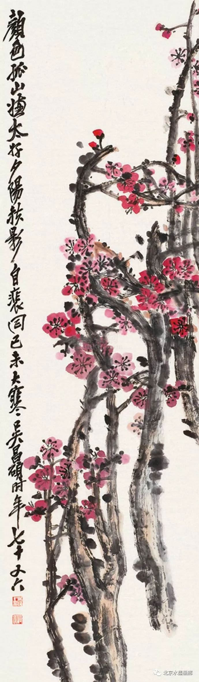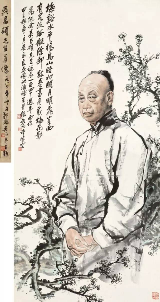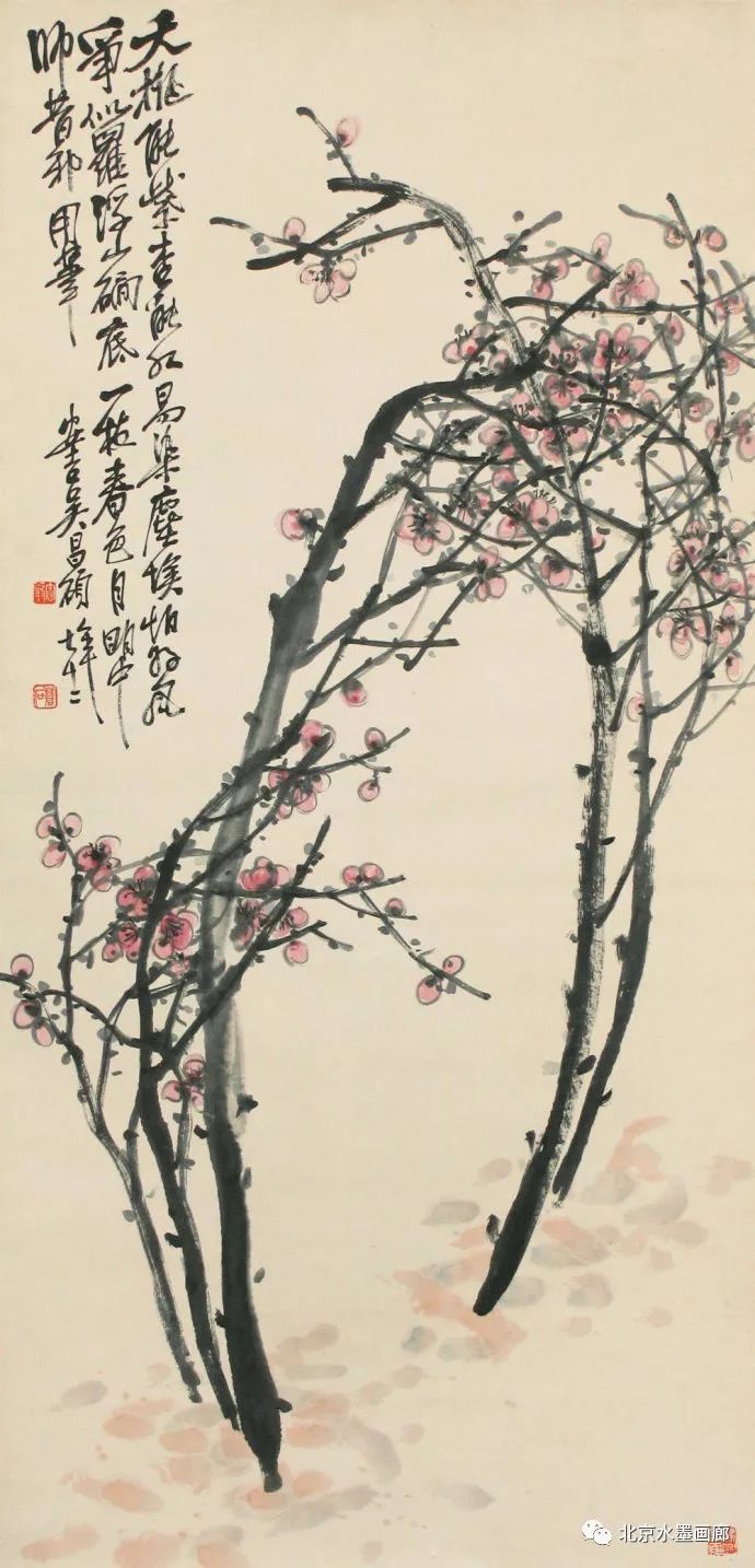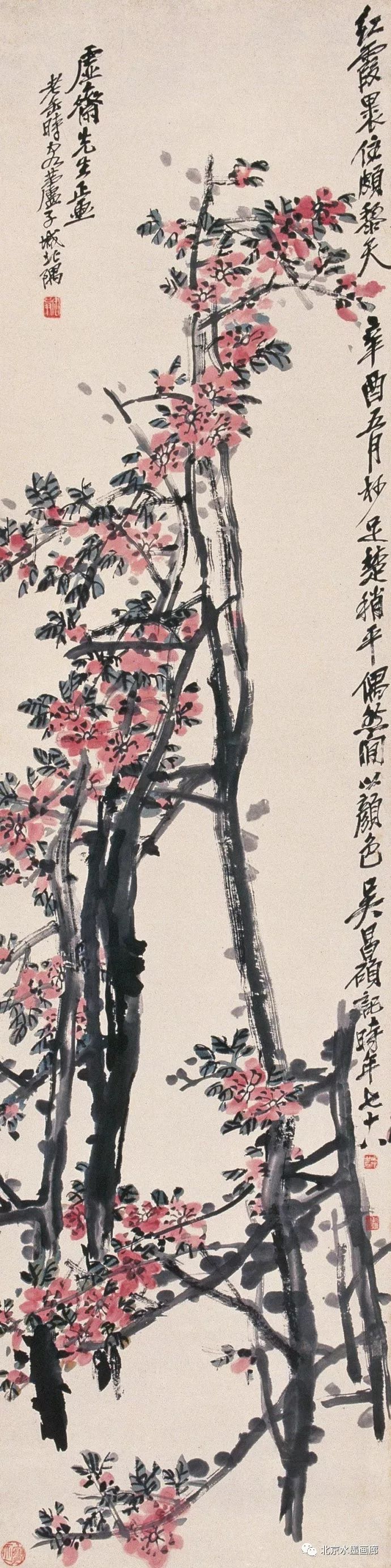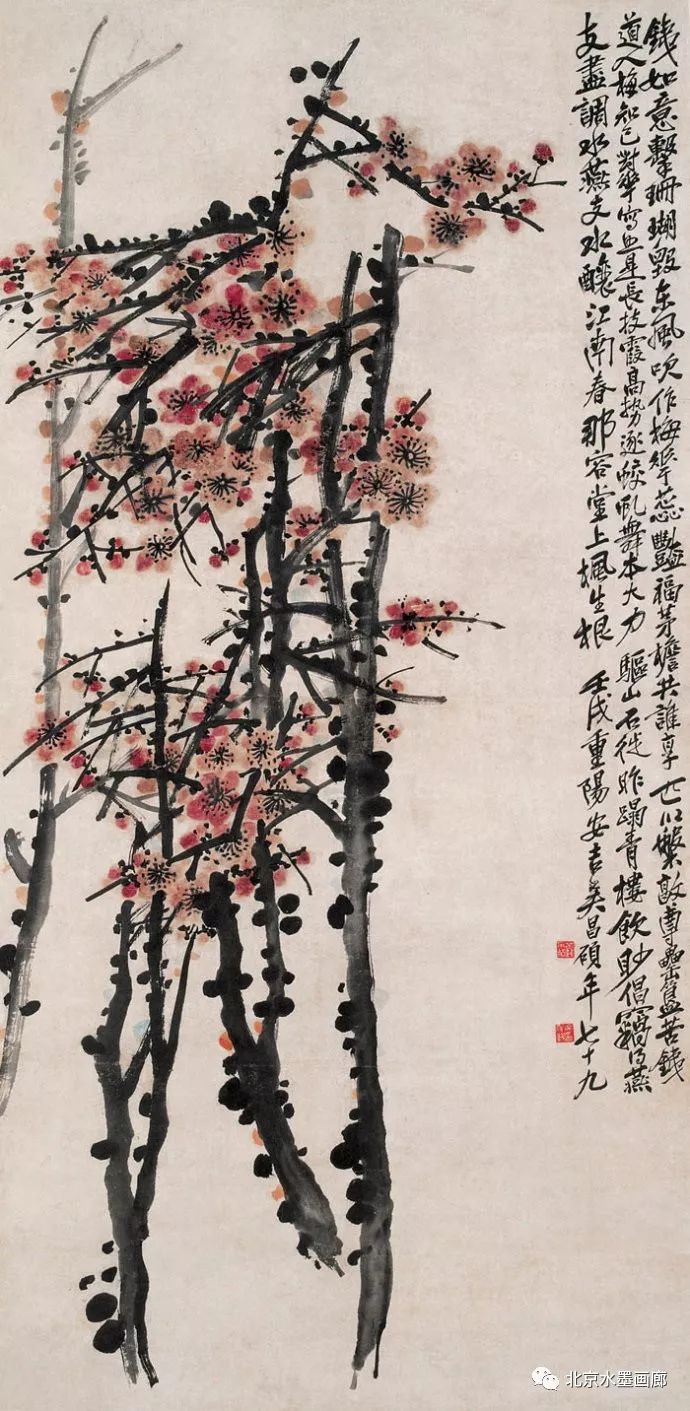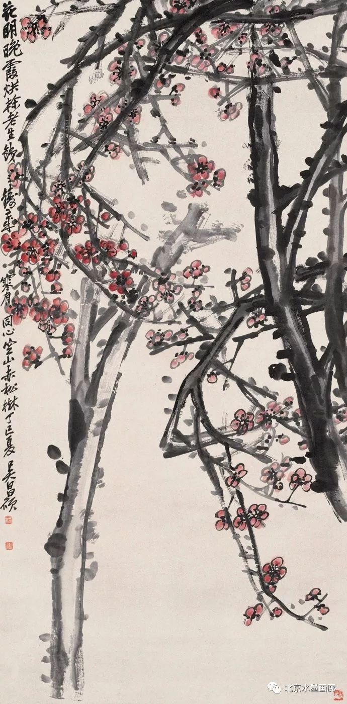 吴昌硕早年专攻书法、诗词和篆刻,后在任伯年的鼓励下学习绘画,先从画梅花开始。他认为,梅花具有“冰肌铁骨绝世姿,世间桃李安得知”的孤傲冷艳和清逸豪放的气质,所以他以画梅来“缘物寄情”,以物附意。他画的梅花,不仅画意深刻,还都配以寄情的诗词,以表达内心的情感。在他60岁的那年,一位日本友人出于对他的敬仰,赠他一口日本古名刀,并希望能得到他的一幅墨梅。当时,中国正遭受列强的侵略,吴昌硕便为这位日本朋友画了一幅《古梅图》。他将老梅倔强不屈的虬干,画成怒龙冲霄之势,并题诗道:“报国报恩无蹉跎,惜哉秋鬓横皤皤。雄心空对梅花哦,一枝持赠双滂沱。”表达了自己忧国忧民的爱国情怀。