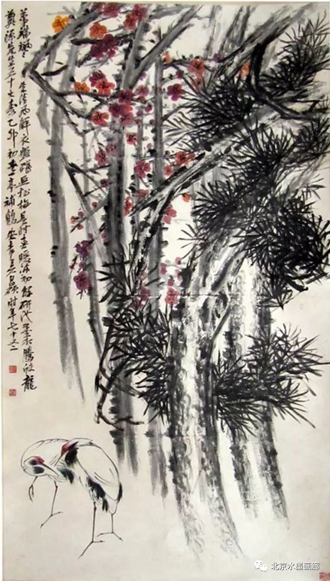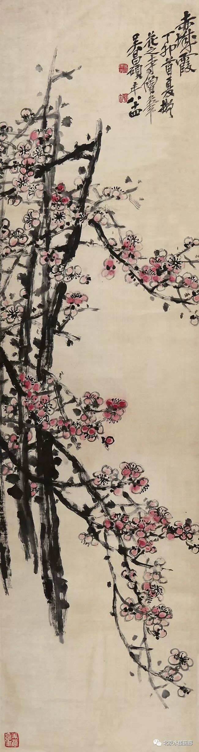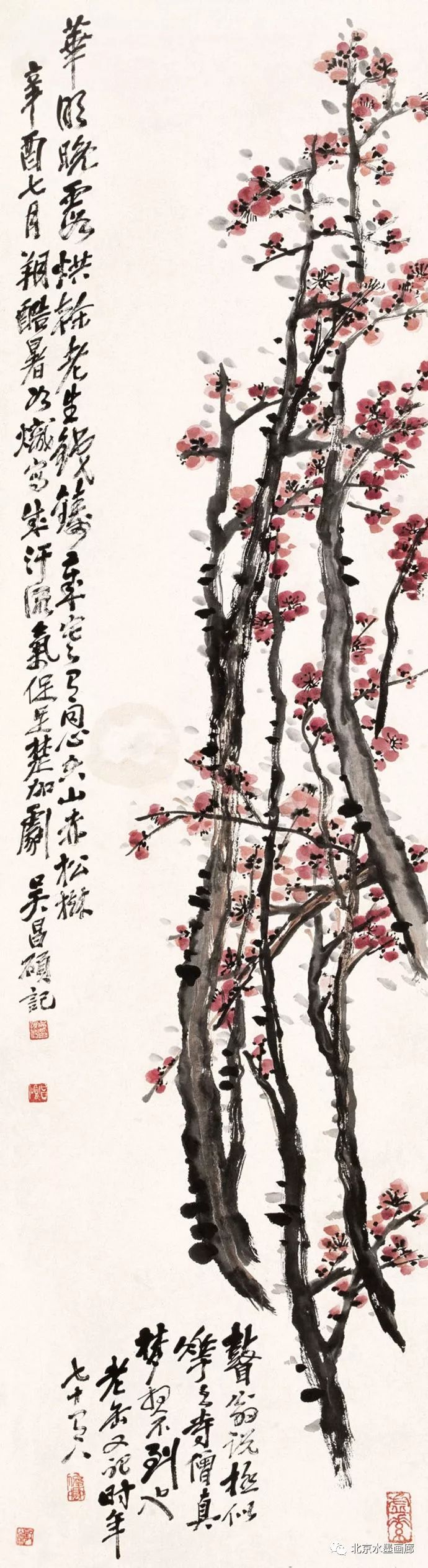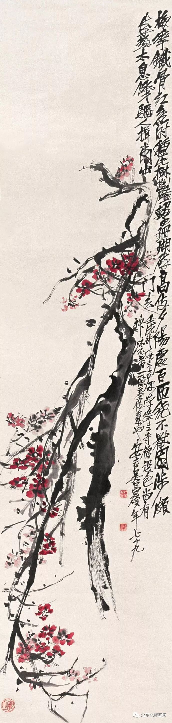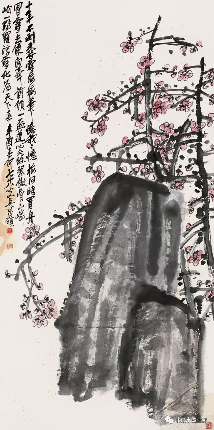 吴昌硕早年专攻书法、诗词和篆刻,后在任伯年的鼓励下学习绘画,先从画梅花开始。他认为,梅花具有“冰肌铁骨绝世姿,世间桃李安得知”的孤傲冷艳和清逸豪放的气质,所以他以画梅来“缘物寄情”,以物附意。他画的梅花,不仅画意深刻,还都配以寄情的诗词,以表达内心的情感。在他60岁的那年,一位日本友人出于对他的敬仰,赠他一口日本古名刀,并希望能得到他的一幅墨梅。当时,中国正遭受列强的侵略,吴昌硕便为这位日本朋友画了一幅《古梅图》。他将老梅倔强不屈的虬干,画成怒龙冲霄之势,并题诗道:“报国报恩无蹉跎,惜哉秋鬓横皤皤。雄心空对梅花哦,一枝持赠双滂沱。”表达了自己忧国忧民的爱国情怀。