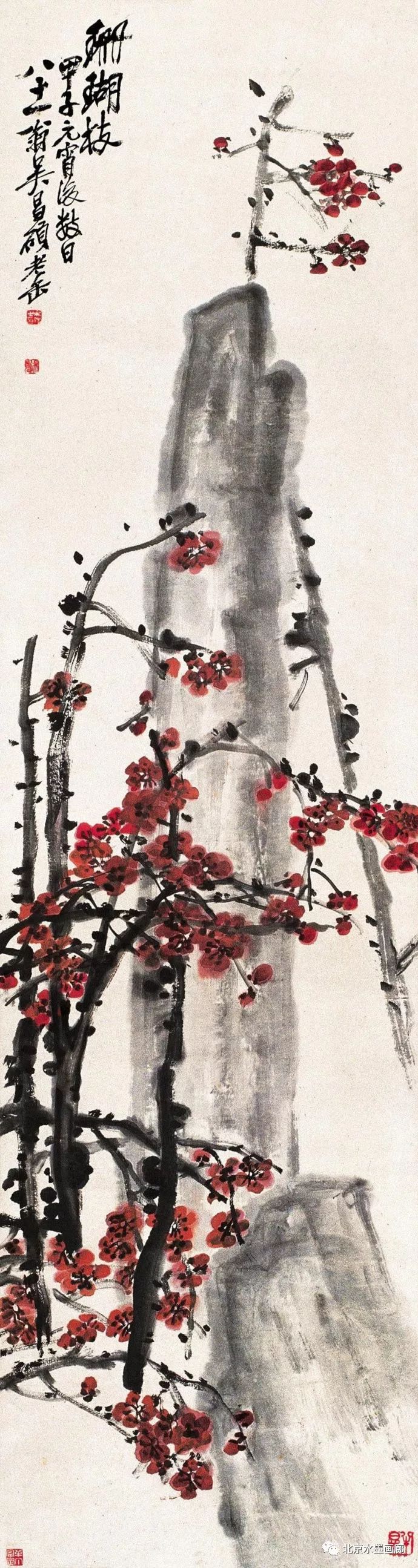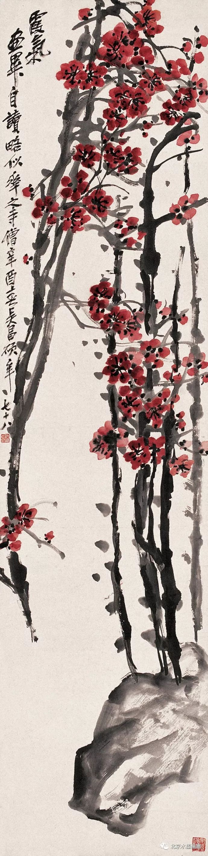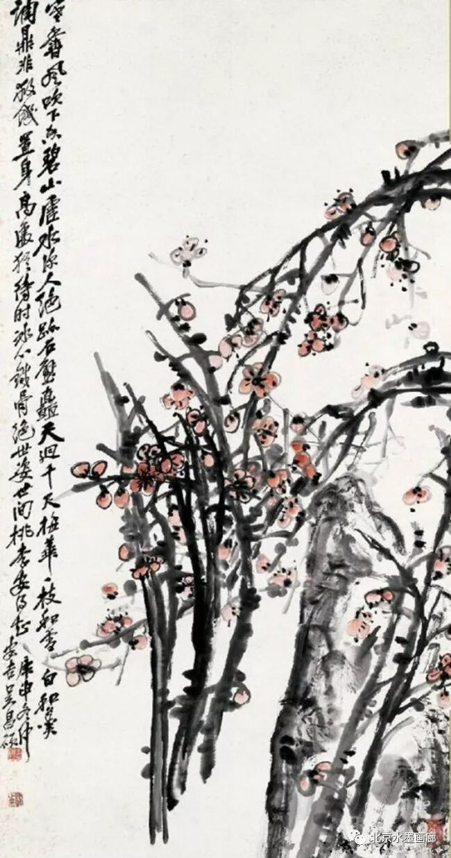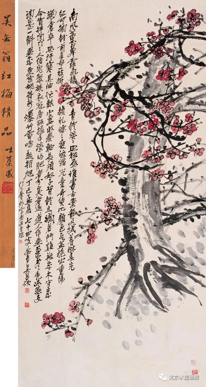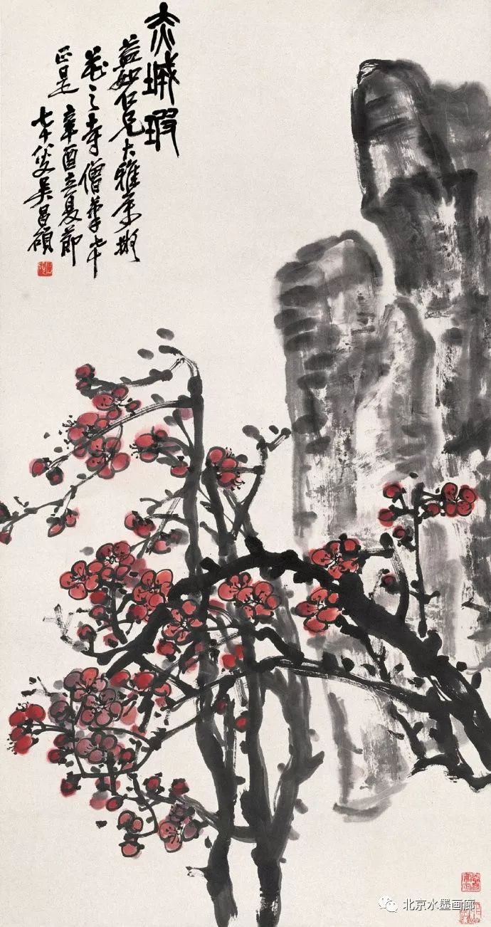 吴昌硕画梅,表现出梅的不同形状,用以表达人的不同情感。他说:“有的梅花,秀丽如美人,有的梅花,孤冷如老纳,有的梅花,坚贞如诤臣,有的梅花,孤傲如侠客。”吴昌硕画的红梅意欲表现出古逸苍冷之趣,否则,他认为无以与夭桃秾李之区别。此外,吴昌硕画梅,常常画石。他说:“石得梅而益奇,梅得石而愈清。”他画梅经常不点色,作品《红梅图》上偶然点色,几方岩石,几枝红梅,横陈在岩石前,花枝茂密,错综交叉,枝条上的朵朵红梅,鲜艳夺目。另有两枝淡淡的红梅,挺立直上,高耸于岩石之上。既表现了梅花的美,又传达了诗人的情。