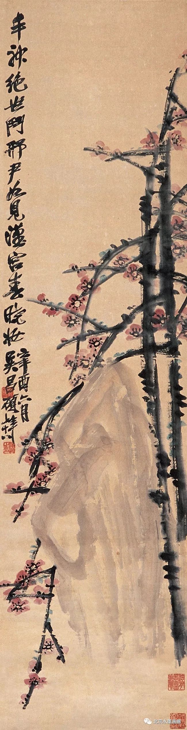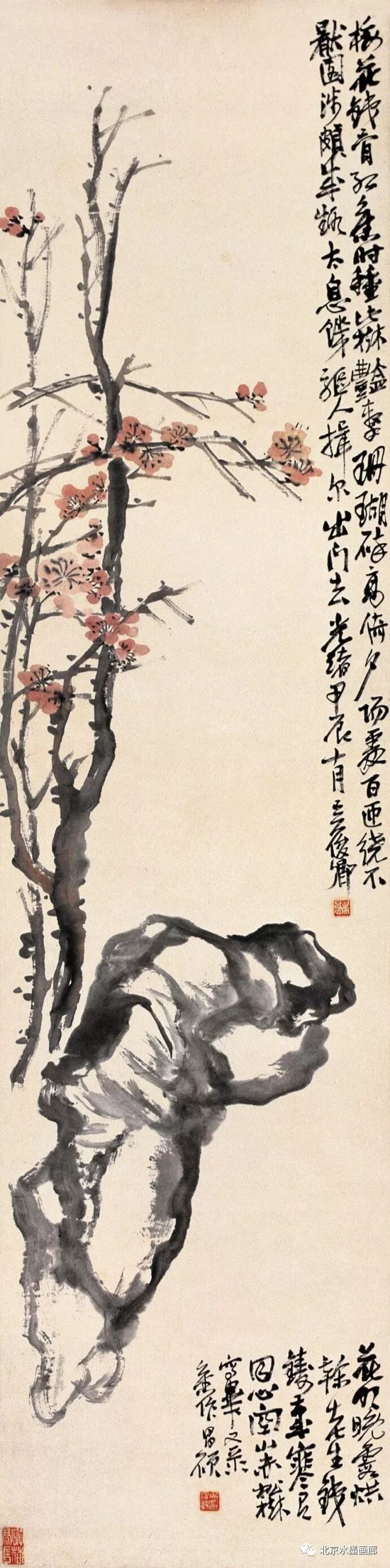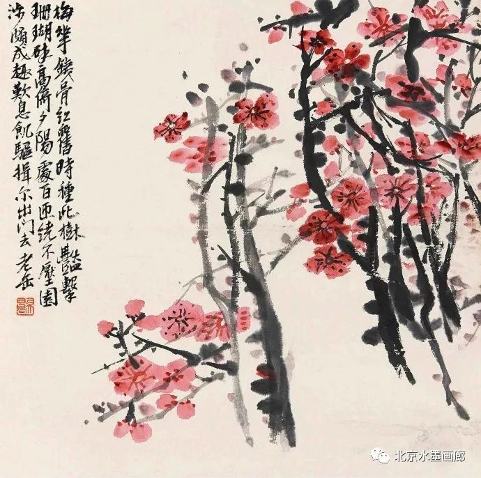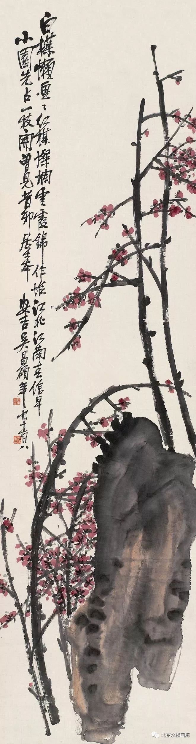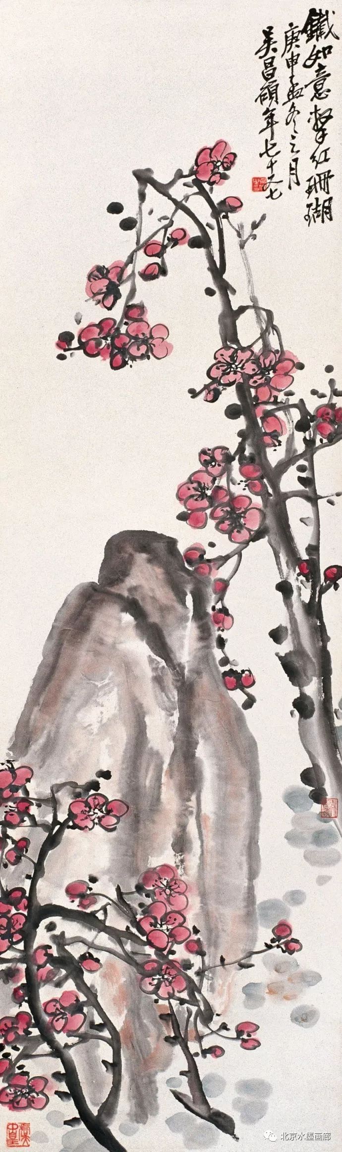 吴昌硕画梅,表现出梅的不同形状,用以表达人的不同情感。他说:“有的梅花,秀丽如美人,有的梅花,孤冷如老纳,有的梅花,坚贞如诤臣,有的梅花,孤傲如侠客。”吴昌硕画的红梅意欲表现出古逸苍冷之趣,否则,他认为无以与夭桃秾李之区别。此外,吴昌硕画梅,常常画石。他说:“石得梅而益奇,梅得石而愈清。”他画梅经常不点色,作品《红梅图》上偶然点色,几方岩石,几枝红梅,横陈在岩石前,花枝茂密,错综交叉,枝条上的朵朵红梅,鲜艳夺目。另有两枝淡淡的红梅,挺立直上,高耸于岩石之上。既表现了梅花的美,又传达了诗人的情。