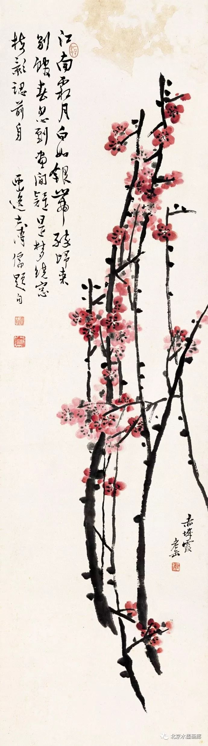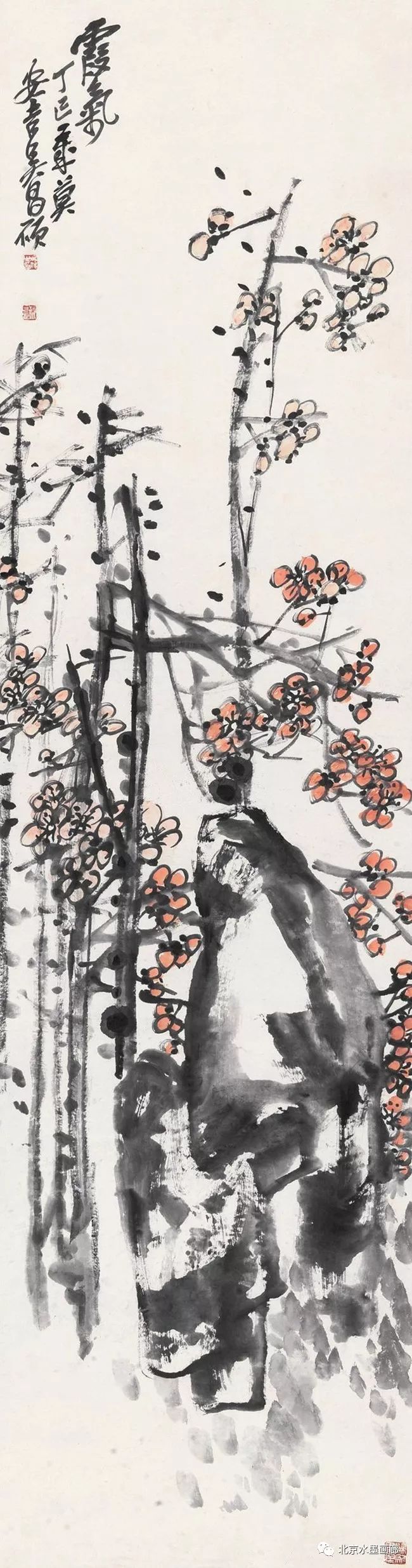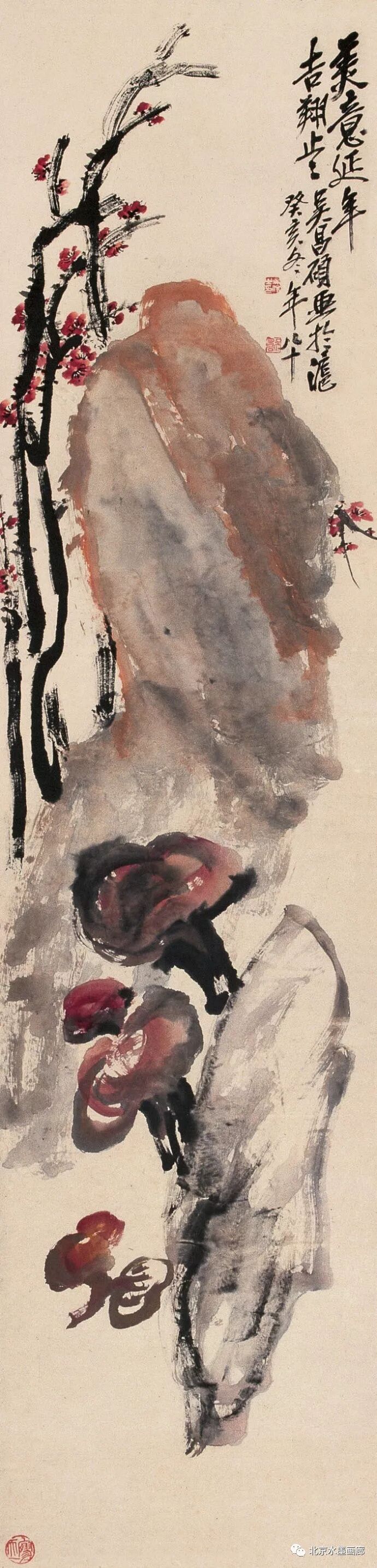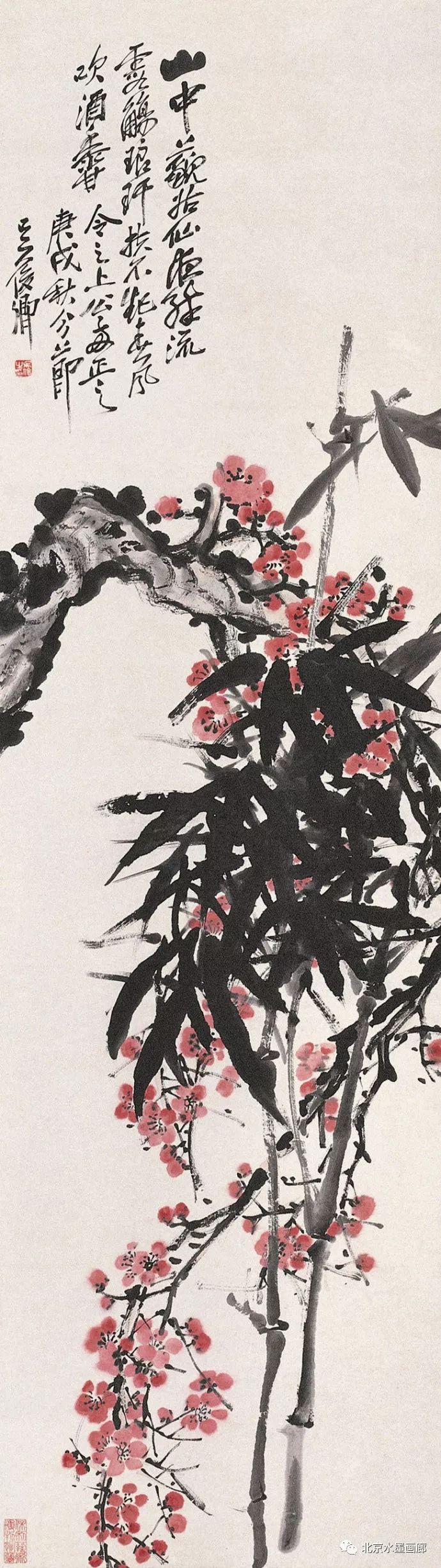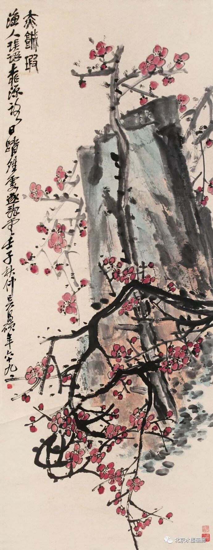 吴昌硕画梅,表现出梅的不同形状,用以表达人的不同情感。他说:“有的梅花,秀丽如美人,有的梅花,孤冷如老纳,有的梅花,坚贞如诤臣,有的梅花,孤傲如侠客。”吴昌硕画的红梅意欲表现出古逸苍冷之趣,否则,他认为无以与夭桃秾李之区别。此外,吴昌硕画梅,常常画石。他说:“石得梅而益奇,梅得石而愈清。”他画梅经常不点色,作品《红梅图》上偶然点色,几方岩石,几枝红梅,横陈在岩石前,花枝茂密,错综交叉,枝条上的朵朵红梅,鲜艳夺目。另有两枝淡淡的红梅,挺立直上,高耸于岩石之上。既表现了梅花的美,又传达了诗人的情。