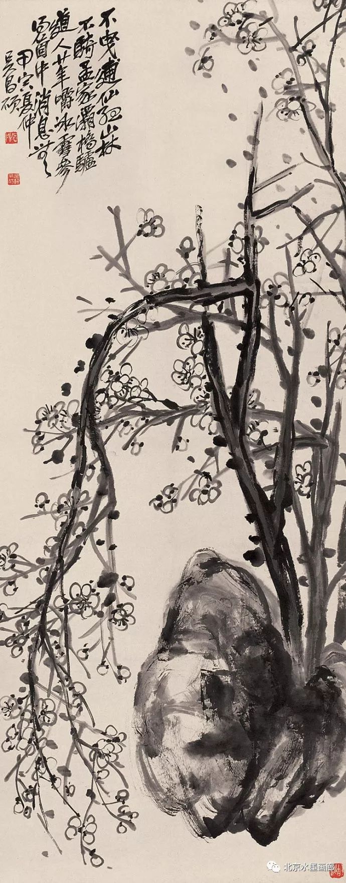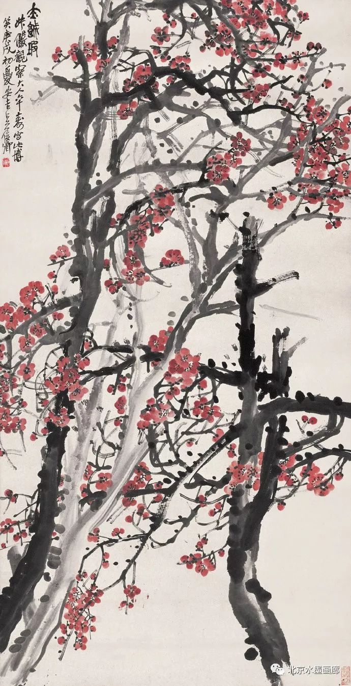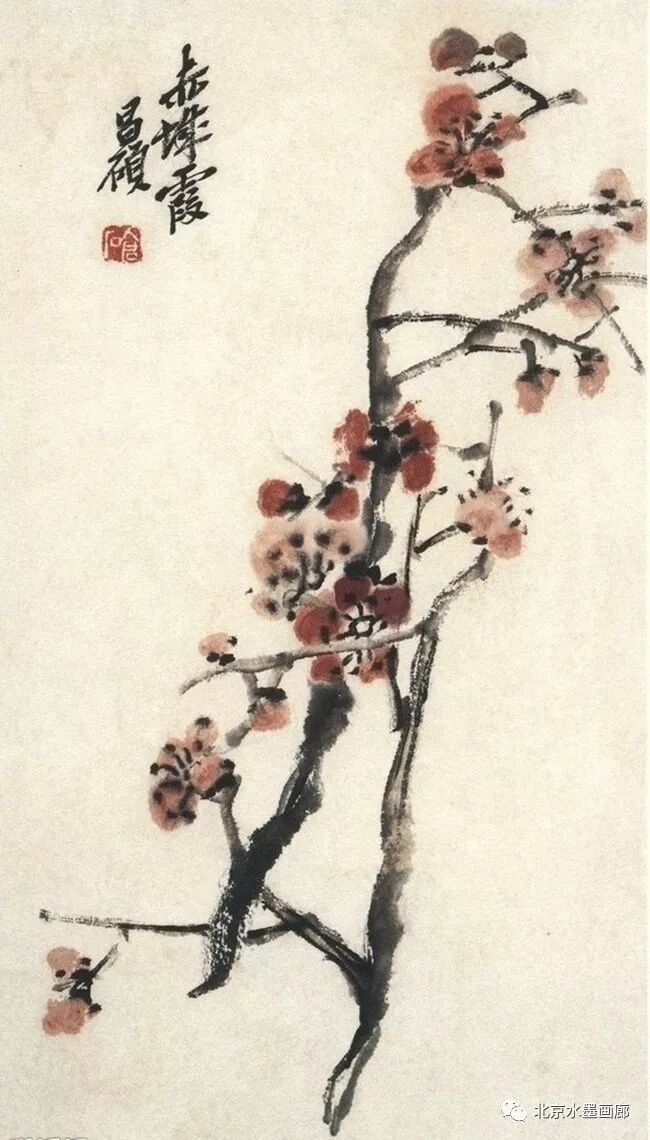 吴昌硕画梅很注重气势。他喜欢用大篆、草书的笔法画梅,作画之前,他总是先凝神静气,然后便运笔如风,一气呵成,自称为“扫梅”,所画之梅自然气势非凡。