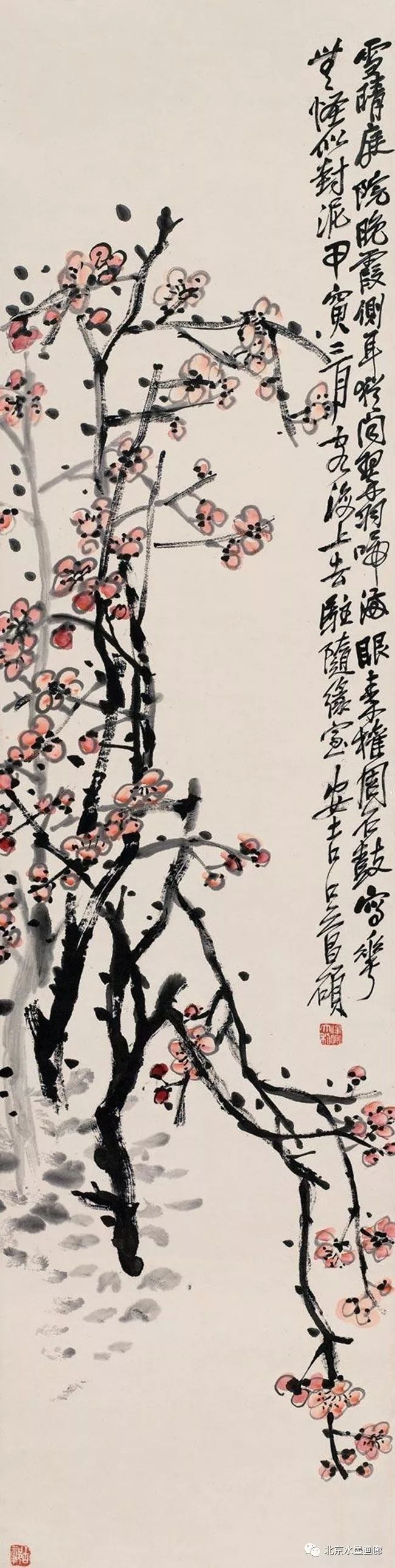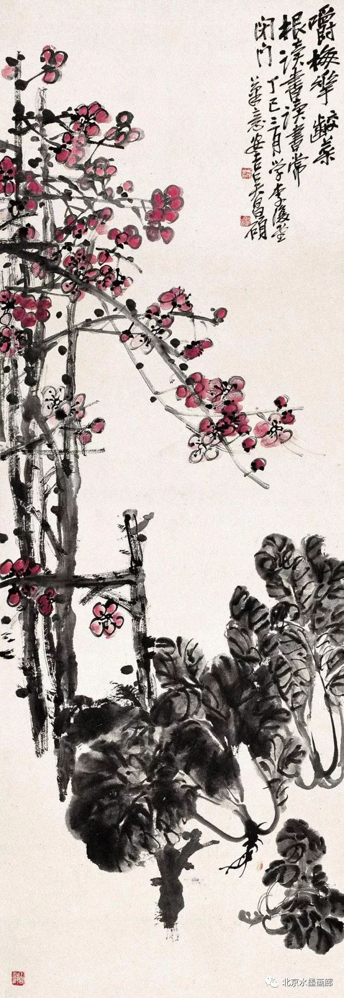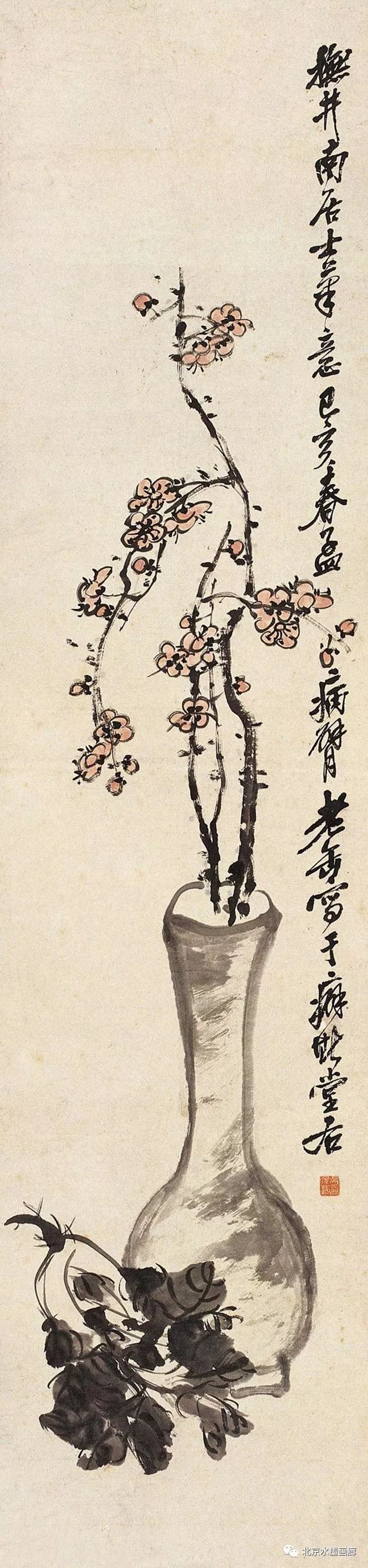 吴昌硕认为,要画好梅,必须要做到胸中有“梅”。为此,每当梅花盛开时,他总要去苏州邓尉、杭州孤山、塘栖超山等赏梅胜地探梅、画梅。为了临摹方便,他还在自家地里种了几十株梅花,名“芜园”。有一年大雪,临家的瓜棚被压垮了,殃及到芜园,将一枝初绽的梅花压折了。吴昌硕不胜惋惜,先是用绳绑扎救治,看看不行,又将其收入到瓦缶中供养。后来,还特意画了一幅梅花长卷,题以长句,记述了当时的痛惜之情。由此,足见其爱梅之深。