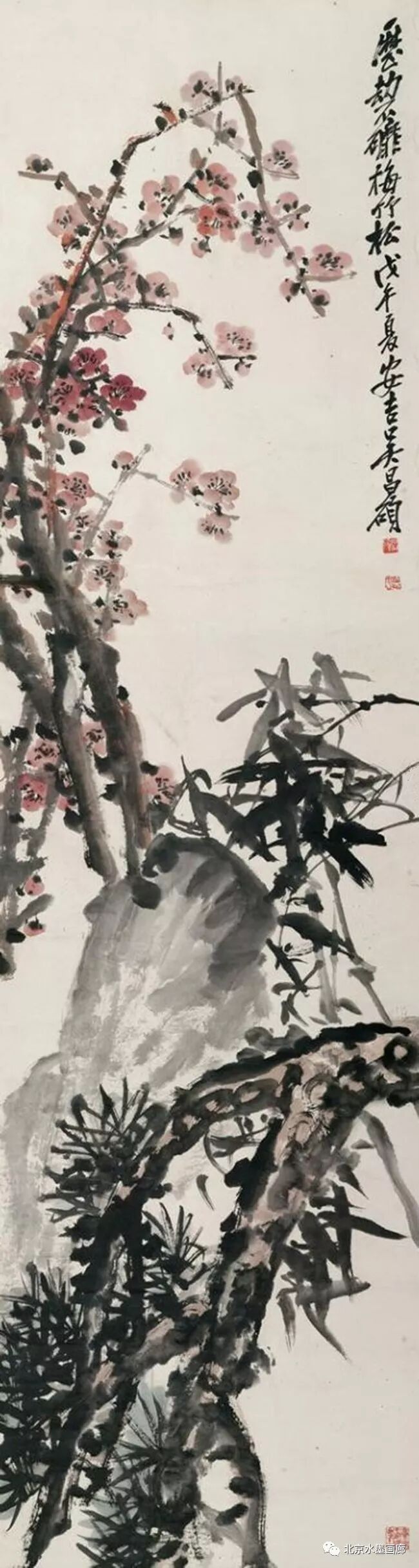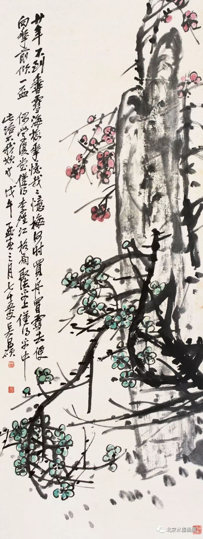 吴昌硕画梅题诗中常有“十年不到香雪海,梅花忆我我忆梅”之句,他笔下的香雪海多指杭州余杭的超山,那是他一生眷恋的地方,也是他的归宿所在。而“梅花忆我我忆梅”是物我观照,思念相永。吴昌硕画梅花并非花讯时候才画,思念是可以反季的,这在他的创作中比比皆是。此画作于“光绪戊戌人日”即1898年的1月28日,此时早发的梅花已绽初蕾,但是吴昌硕人在上海,作此画是“我忆梅花”——每年这个时候他都会想到梅花。所画不是“疏影横斜”,而是密枝繁花,虚实与浓淡的处理特别好。尤其淡墨所绘,不仅衬托了画“黑”和“实”,也淡出了一种空灵和虚缈,不仅让人看到了梅枝正面、侧面的花,也让人看到了梅枝背面的花。梅花富含诗意,画家画梅也必须以诗意的眼睛去观照。诗意在哪里?在绽放的花蕊里,更在虚缈的氛围里。书法也好,所题是两首七言绝句,气势与画相匹。这令人想起了吴昌硕那句著名的“三十学诗,五十学画”的话,“五十学画”?才几年时间能画到这个程度?可见是谦词。吴昌硕心气自少年时起就极高,但是言谈举止却谦虚,他是传统文人,有大德之美。