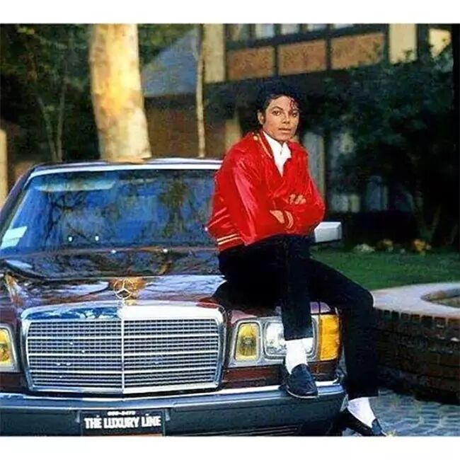 Michael Jackson 坐在自己最爱的大奔上,依然是经典的白袜子 + 黑皮鞋的搭配!