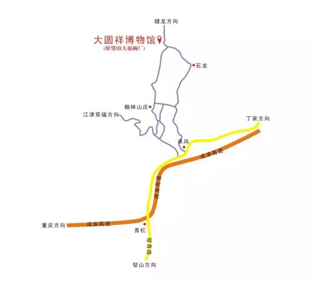 公交路线:璧山801路公交车——来凤医院门口(转乘至健龙班车)——大圆祥博物馆(过翰林山庄后,前行约四公里即到)