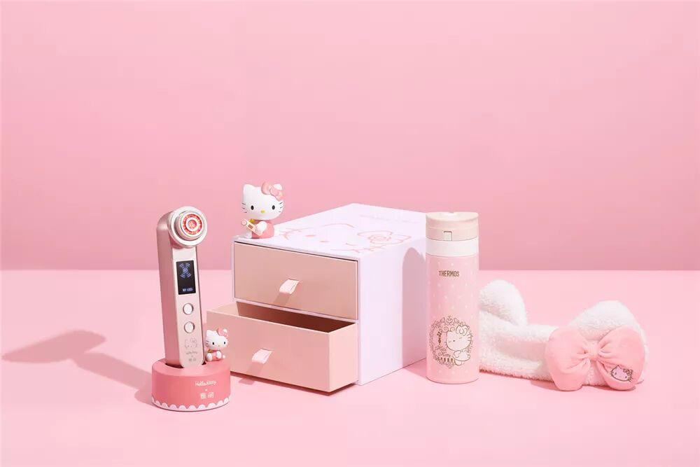 这次雅萌更是和Hello Kitty推出了联名限定美容仪礼盒,除了有印着Hello Kitty头像的定制款多功能射频美容仪,还有各种可爱好玩又实用的Hello Kitty粉嫩萌物,让美容也变得十分有趣。