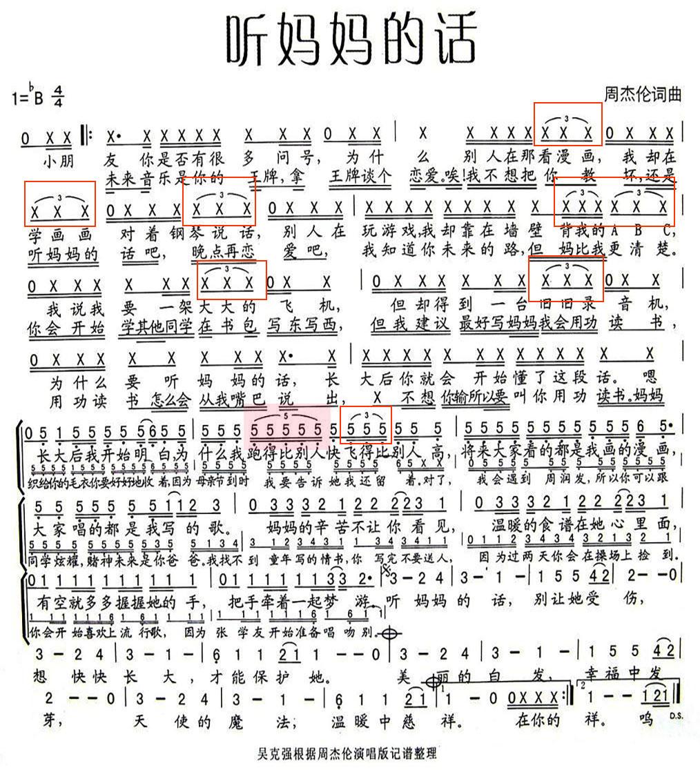 7、切分音狂魔……修饰音狂魔……多连音狂魔……简称就是炫技狂魔。小生当年试图过抓他的一些歌的节奏,然后和节拍怎么都对不上,看了之后才发现是切分音……而且他有一个他独有的创新:将重拍放在修饰音上(修饰音就是那种极短的迅速的一闪而过的音节,叮铃一下的感觉,是为了乐句加花而用的),代表作品是《骑士精神》第二段主歌里的“他们的语气,好笑的攻击,自卑的心理”,语气,攻击,心理等这几个词都迅速的一闪而过,而且不占拍子(应该是吧),但是重拍却都放在他们身上……哇,那震撼,那酸爽,那叼炸天……我没见别人用过(敢用过)。多连音更是……代表除了前边提到的《龙卷风》,还有一首大家都非常熟悉的《听妈妈的话》,噢,3连音一堆!甚至还有五连音!上一张图,大招已经大致标注了……