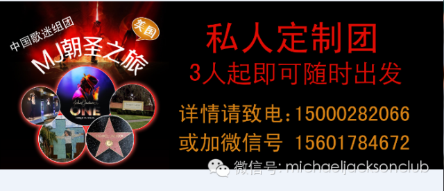 中国歌迷第12次/13次【美国MJ朝圣之旅】将于2018年6月下旬及8月下旬(8月为MJ诞辰60周年主题之旅)从上海出发!为期8天,我们将前往位于洛杉矶和拉斯维加斯的近20处MJ景点,包括好莱坞星光大道,梦幻庄园,森林草坪公墓(玫瑰花海),Thriller鬼屋,Dangerous双眼等多处MJ涂鸦,加德纳小学MJ礼堂,及观看MJ One致敬演出,MJ One官方店扫货,参观MJ新雕像及其他Vegas酒店里的MJ展览和景点!还会参加数个美国官方歌迷活动!!!