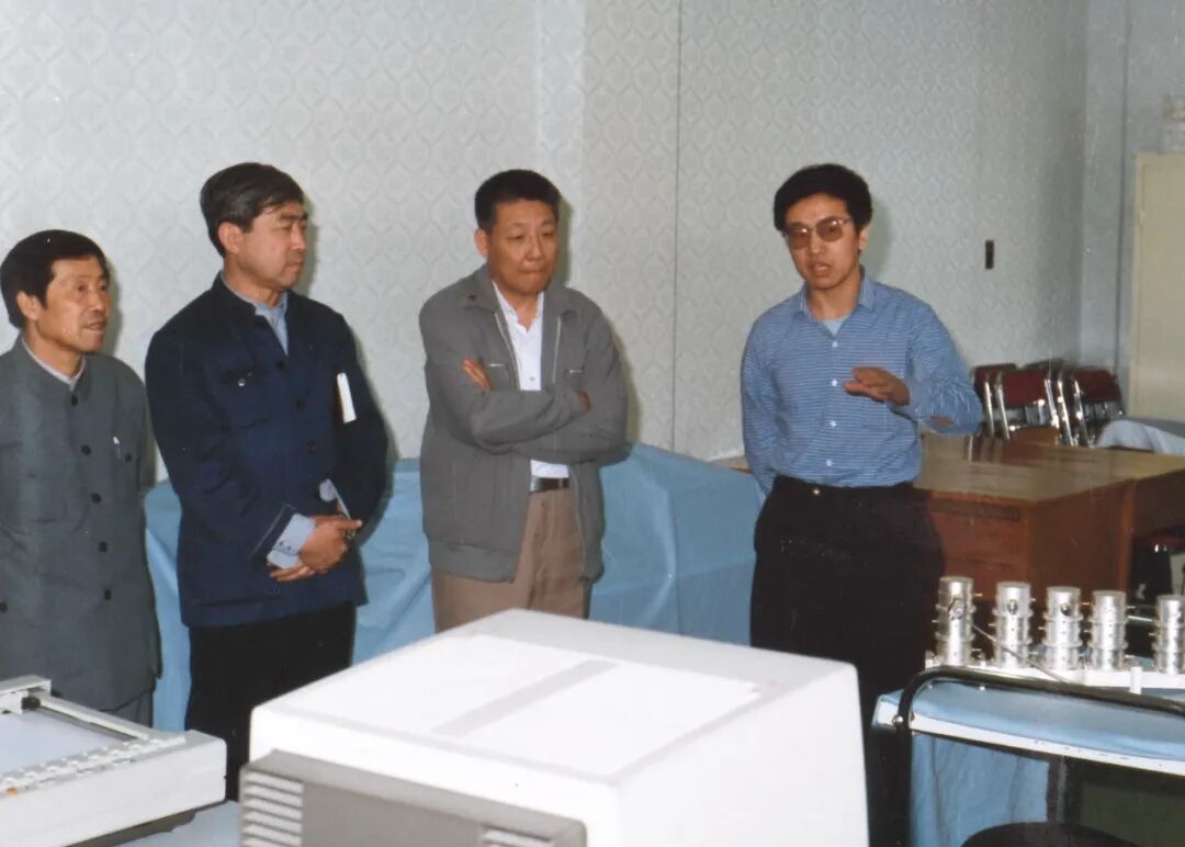 ▲ 1989年航空航天工业部领导孙家栋(右二)和五院领导戚发轫(左二)到五〇四所检查工作,谢军(右一)在研究室汇报任务情况