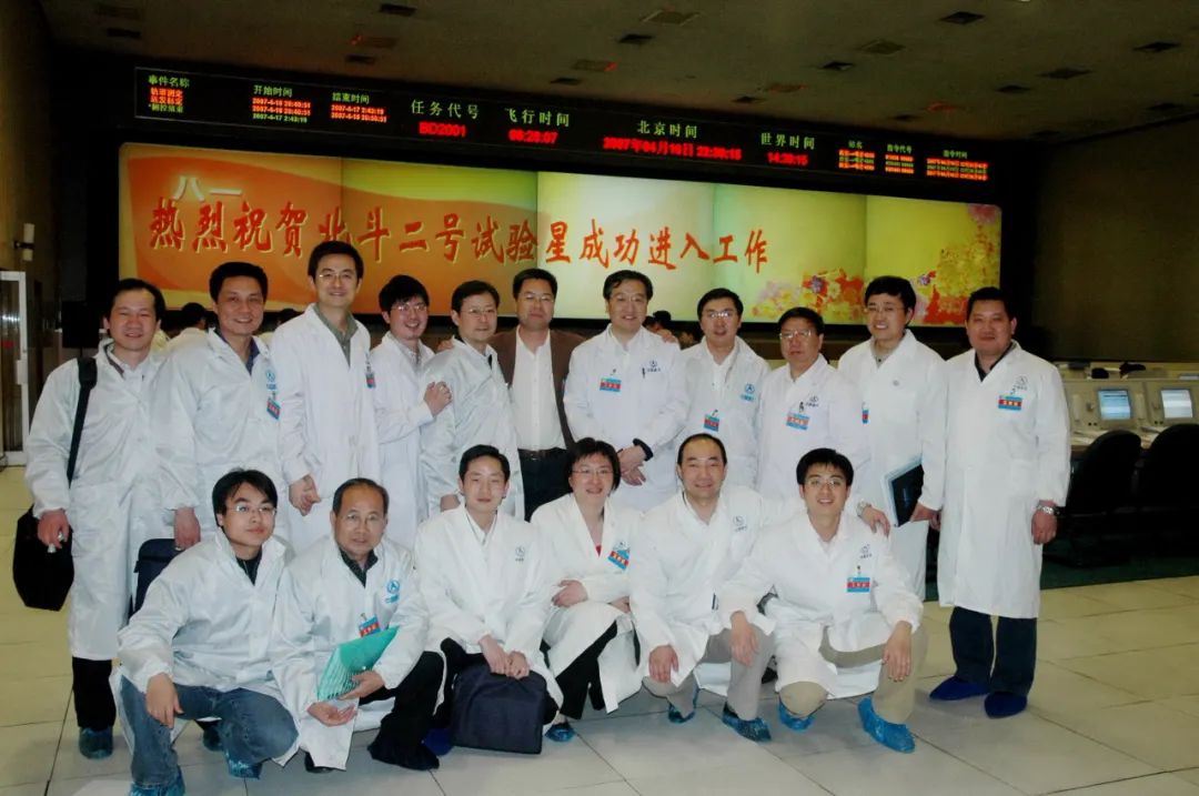 ▲ 2007年北斗二号卫星飞行试验星成功发射并顺利开通载荷,谢军(后排右五)与倍感振奋的五〇四所研制队伍合影