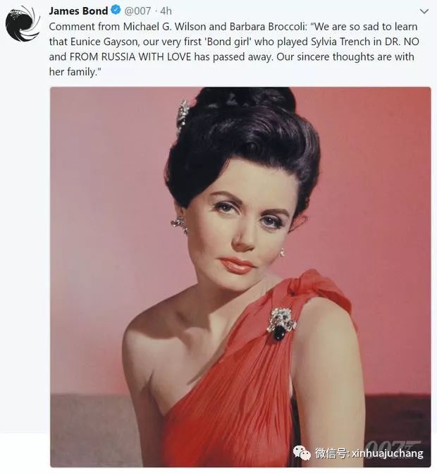 在1962年《007之诺博士》中出演的首位“邦女郎”尤妮斯·盖森去世,享年90岁。