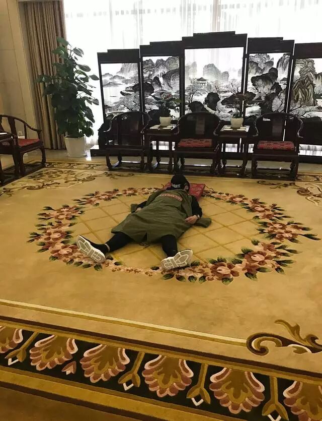 陈赫躺在机场休息室的地毯上也能睡着,还自称“作为一名屌丝”,如此无讲究,天为盖地为席,霸气得不要不要的。