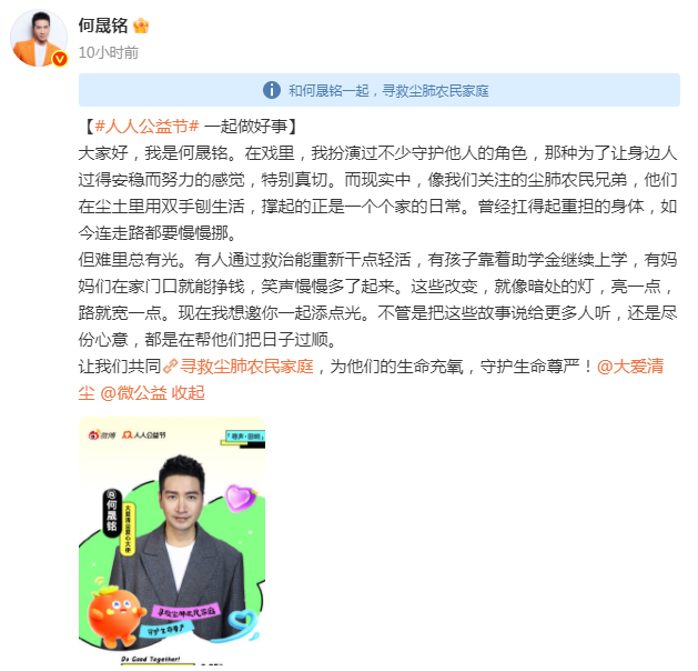 又趁热度做起了公益,以“尘肺病救助”为主题发文,呼吁大家关注尘肺农民群体。