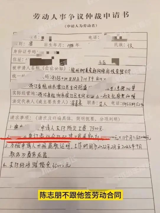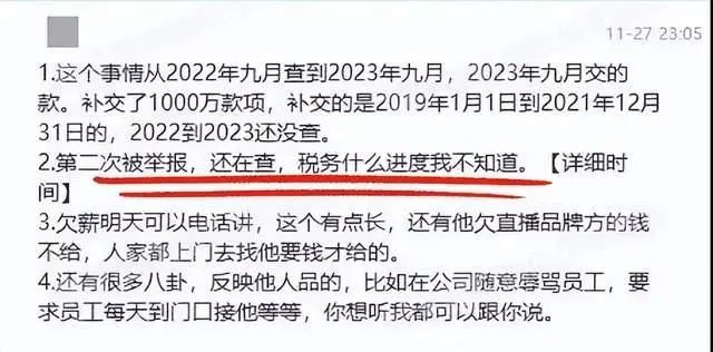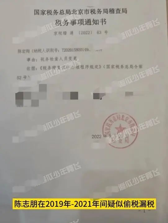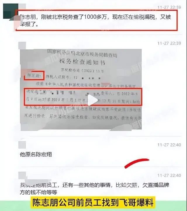 爆料人表示2019年1月1日到2021年12月31日这三年,一直到今年9月初,陈志朋大概补缴税款1000多万,2023年又再次被税务机关缉查。陈志朋前员工还爆料与他合作的两年时间内,陈志朋不和自己签劳动合同,违规解散公司后又拖欠爆料人赔偿金,拒绝开具离职证明。