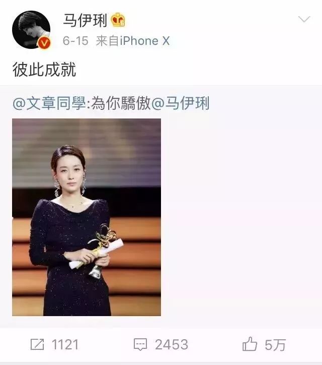 上个月,马伊琍凭《我的前半生》拿了白玉兰“视后”,文章第一时间发老婆现场美照并附文“为你骄傲”,马伊琍转发了这条微博,也附文“彼此成就”,和当年的“且行且珍惜”一样,这次的四字简言似乎又要成为经典了。