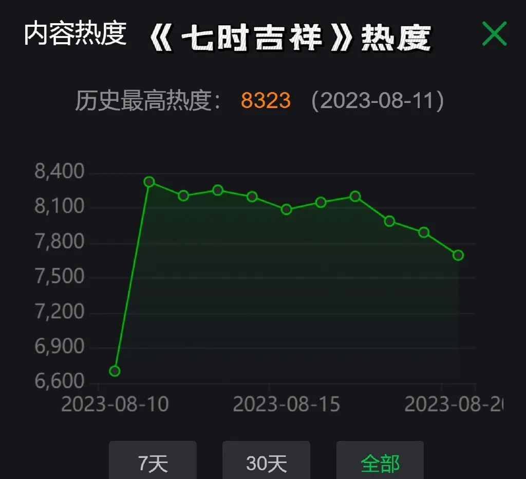 竖向对比同档期的《消失的痕迹》,爱奇艺临时抬上来的一部分账现代剧,无流量零宣传,热度已经破7500弯道超车《七时吉祥》了。