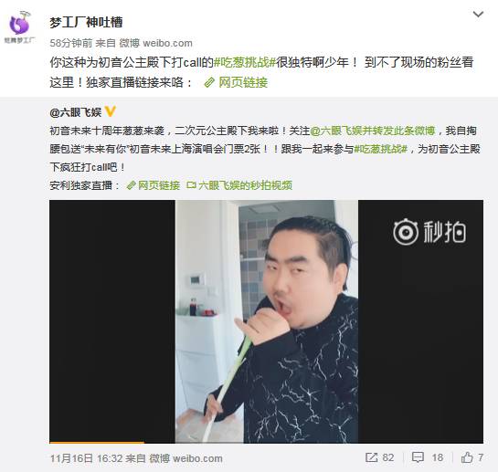 90后的小编看到这里简直想哭,心里默默替80后的前辈们悲伤。不过小编还是不住感慨,初音未来是我心目中永不老的公主殿下,她有最甜的歌喉,最美的容貌,最轻盈的身姿,以及最爱的一头绿发。后来有网友在微博发起热门话题#吃葱挑战#来力挺初音!棒棒的!