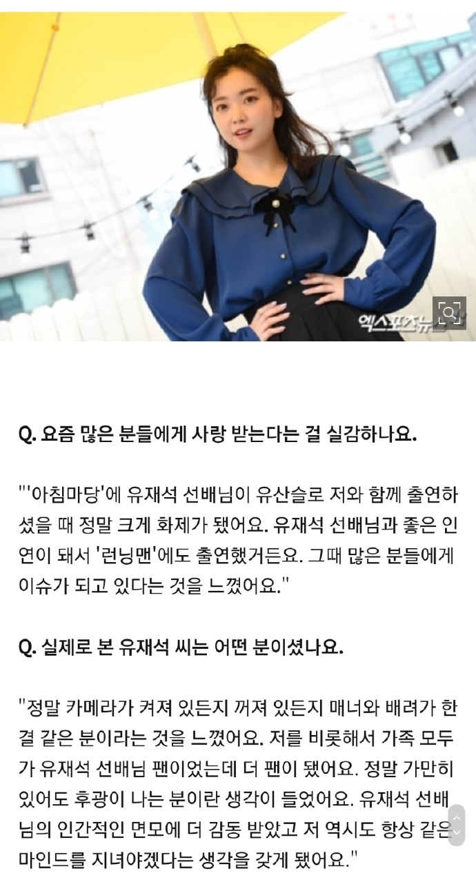 “在清晨庭院和刘在石前辈一起出演以后真的成为了很大的话题。和刘在石前辈结成了好的关系以后还出演了RM。那时候真的感受到了成为了很多人的话题。”