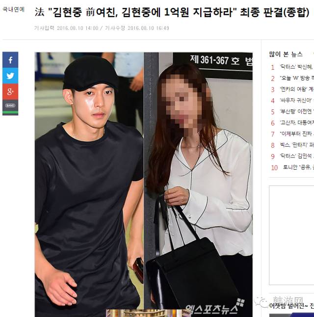 8月10日,首尔中央地方法院今天下午对金贤重和他的前女友A某之间的索赔诉讼做出判决,宣判金贤重胜诉,并要求前女友A某赔偿金贤重1亿韩元。