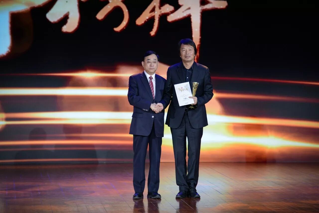 北京人民艺术剧院院长任鸣向著名表演艺术家吴刚颁发“年度表演艺术青年导师”荣誉