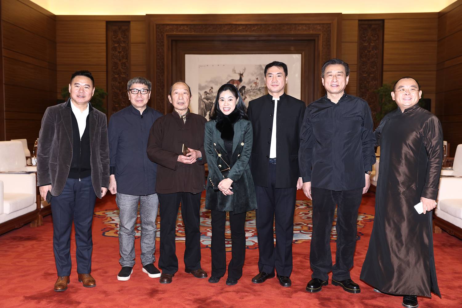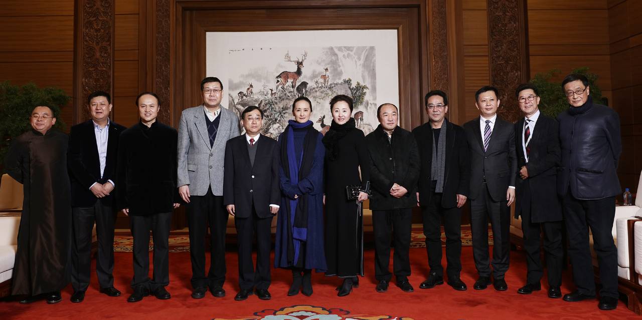 北京青年报社社长张延平与人民日报社副社长张建星、永新华控股集团董事局主席李永军、北京人民艺术剧院院长任鸣、中央芭蕾舞团团长冯英、中国国家画院常务副院长卢禹舜、中国国家话剧院院长周予援、北京市企业家协会常务副会长杨健、中国首位世界级钢琴制作大师施岩、中国摄影家协会顾问王文澜、青年书画家家昌等嘉宾合影留念。