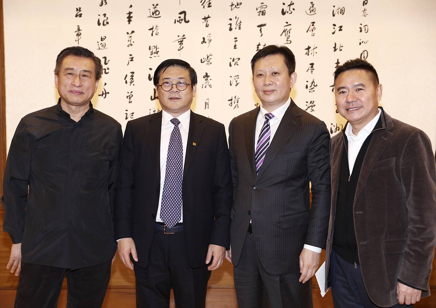 文艺批评家姜强国、中国美术家协会驻会副主席徐里、北京市企业家协会常务副会长杨健、丰极传媒董事长王极合影。