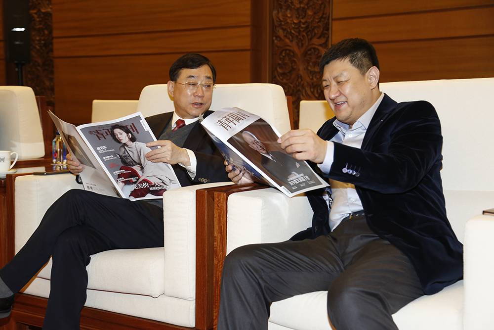 人民日报社副社长张建星与永新华控股集团董事局主席李永军在活动现场翻阅《北京青年》周刊。