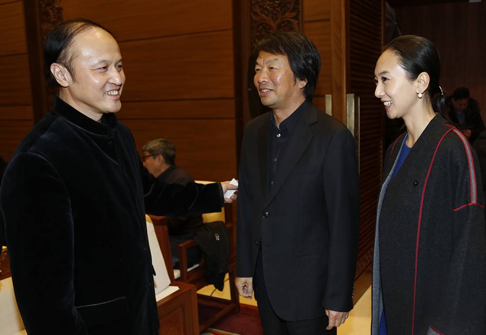 北京青年报社社长张延平与著名作家刘震云及他的女儿、青年导演刘雨霖亲切交谈。