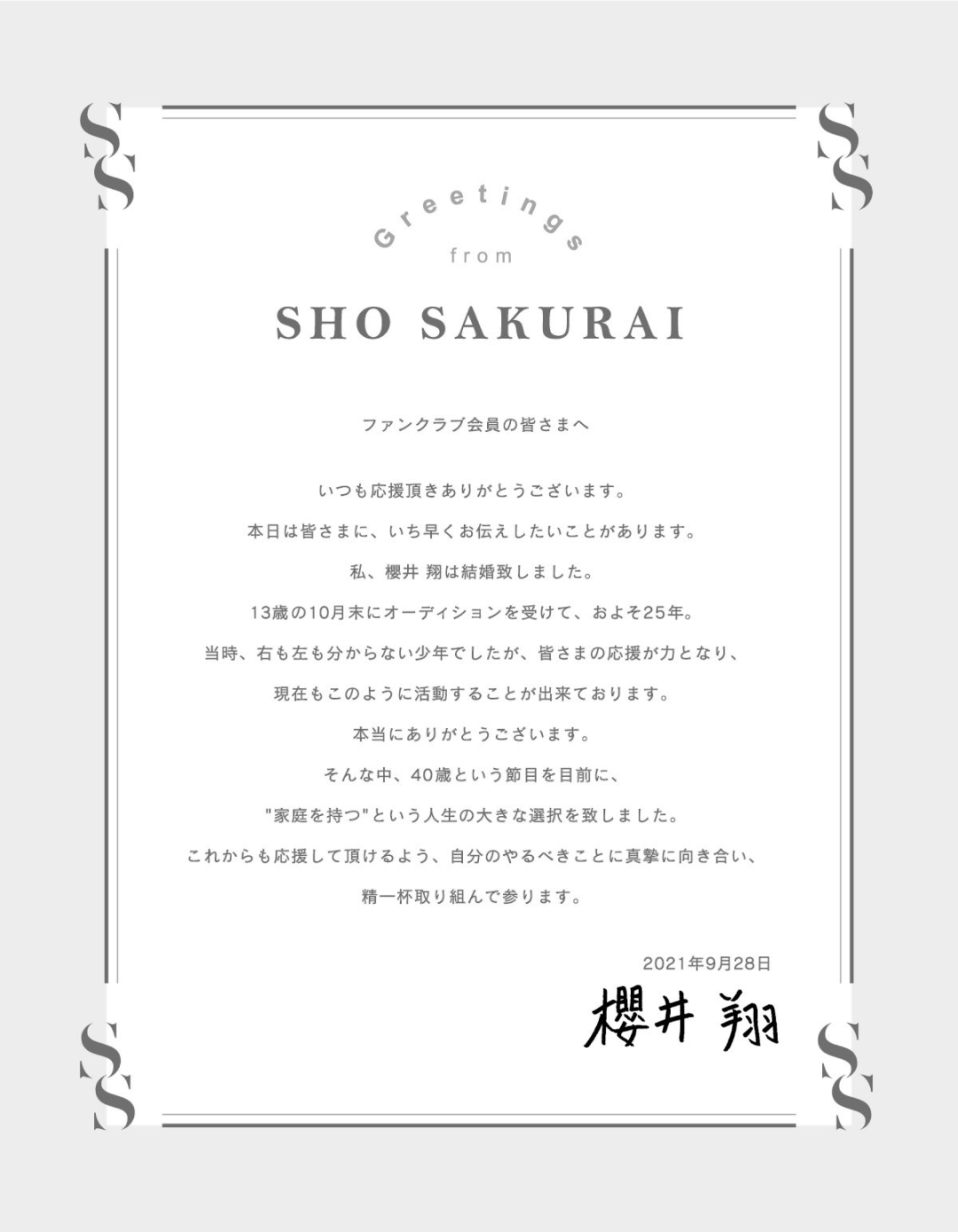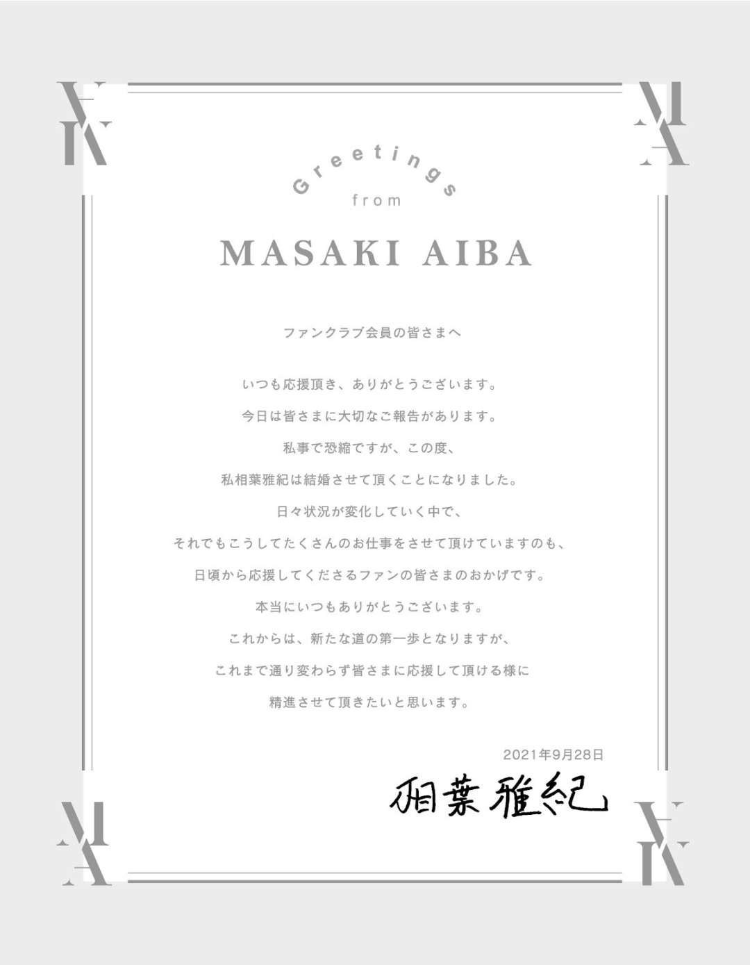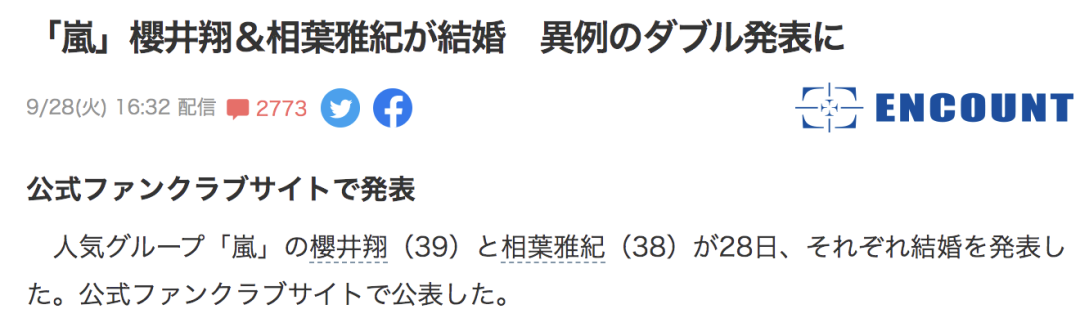9月28日,休止中的日本偶像组合岚的成员樱井翔(39)、和相叶雅纪(38)同时在粉丝俱乐部宣布了结婚的消息!!