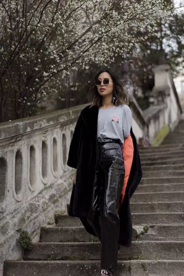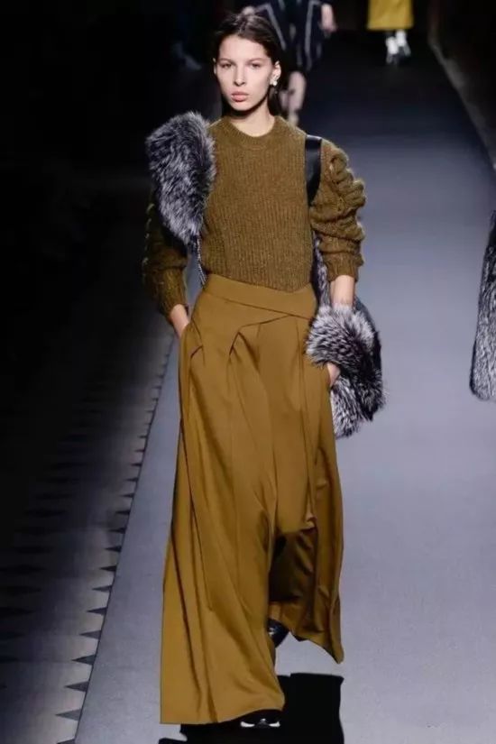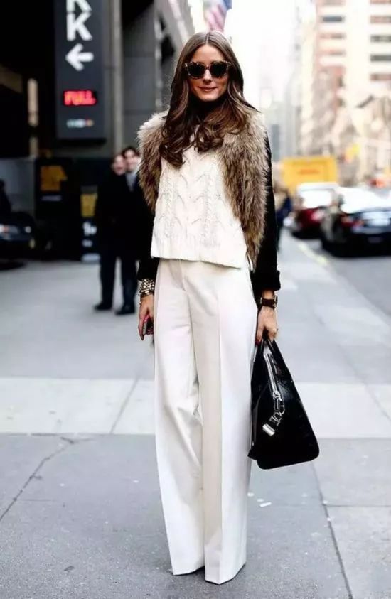 (3)肩披皮草外套,用百搭的阔腿裤来拉长线条,全身一色系气场感油然而生。