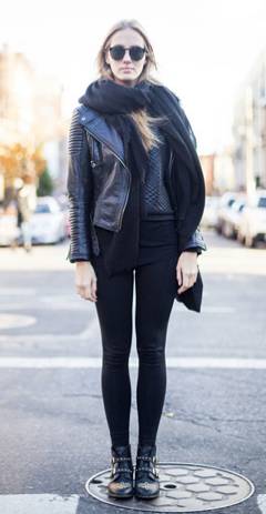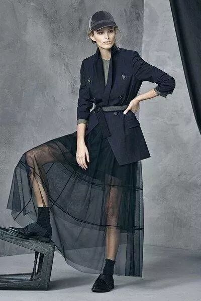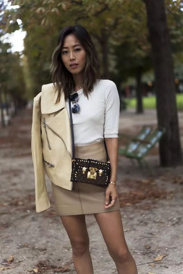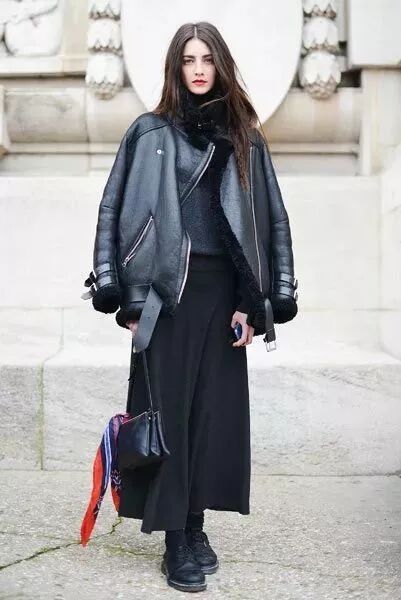 (2)厚重的飞行员夹克用半身长裙带来轻盈,是冬季视觉减重的时髦法则。