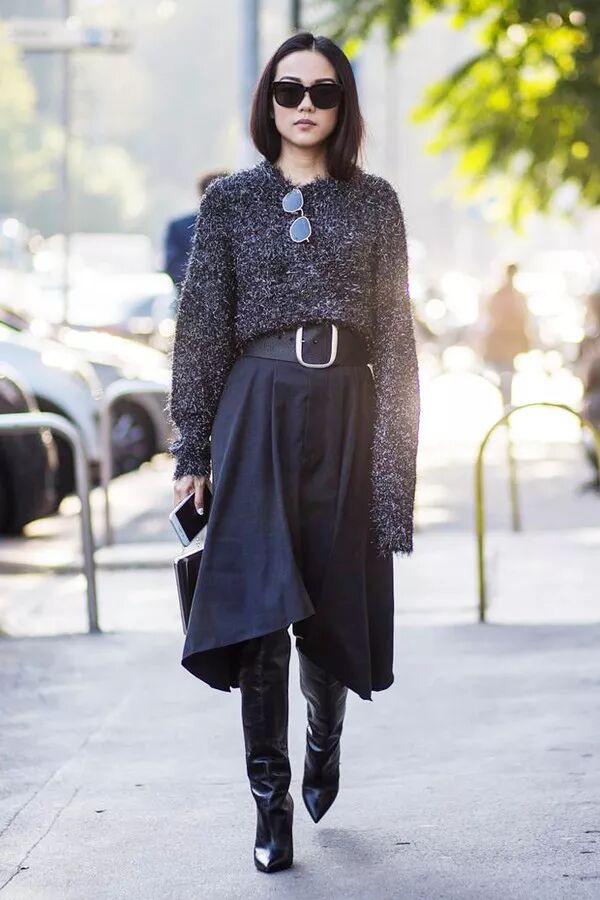 (4)雪纺、皮质、西装、丝绸、蕾丝、毛衣、棉质、牛仔、貂毛、天鹅绒等各种材质可以混搭(遵循软+硬/上宽下窄混搭规律),作为腿短喵星人屡试不爽。