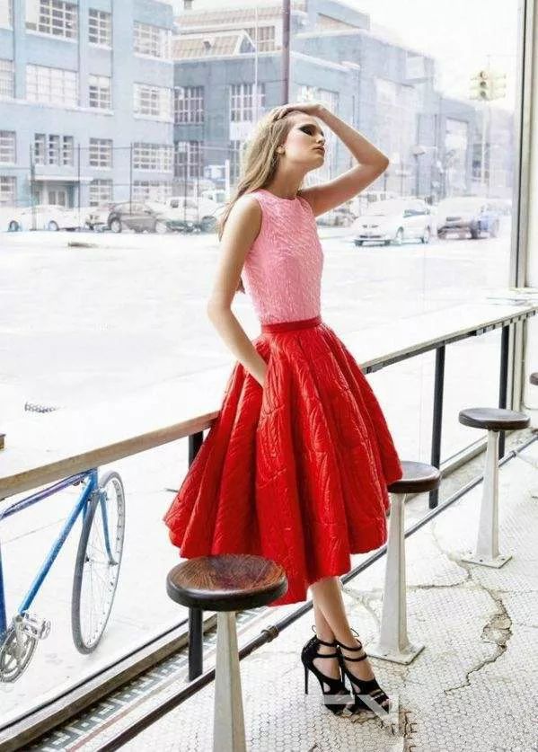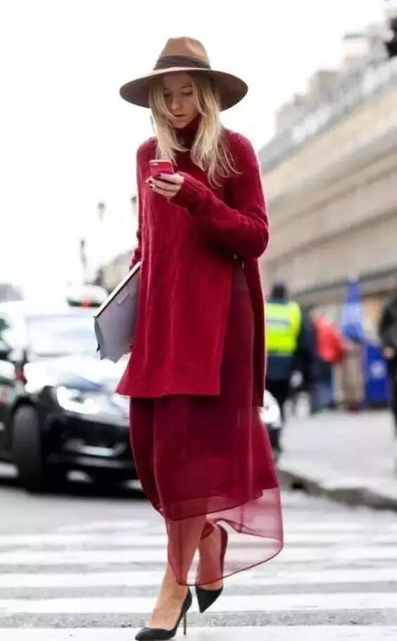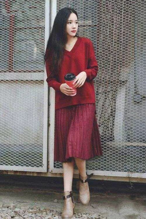 红色给人性感热情奔放的感觉,更给人一种冷艳感。运用红色系不同色度更具层次感,强势个性显脸色白皙。(建议上浅下深可以显腿长)