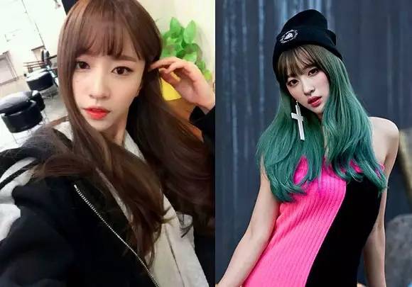 Hani(EXID组合):自从哈尼爆红之后,观众似乎有点看厌了哈尼的小卷发和空气刘海,但是此次发新歌哈尼一头绿发真的让人眼前一亮,绿色的发色让哈尼减少了一点少女气但是多了一丝神秘感!绿发好评!