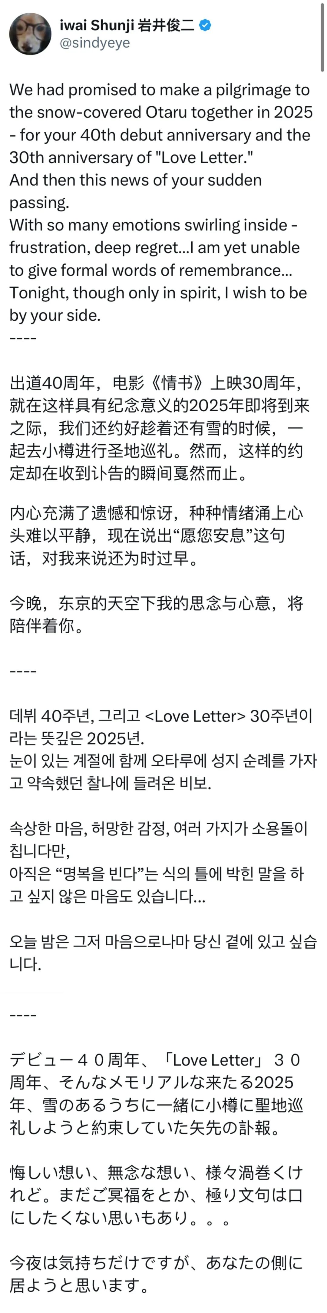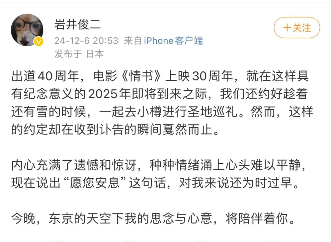 30年前拍摄了中山美穗代表作之一《情书》的岩井俊二导演,用多国文字发表了自己的悲痛