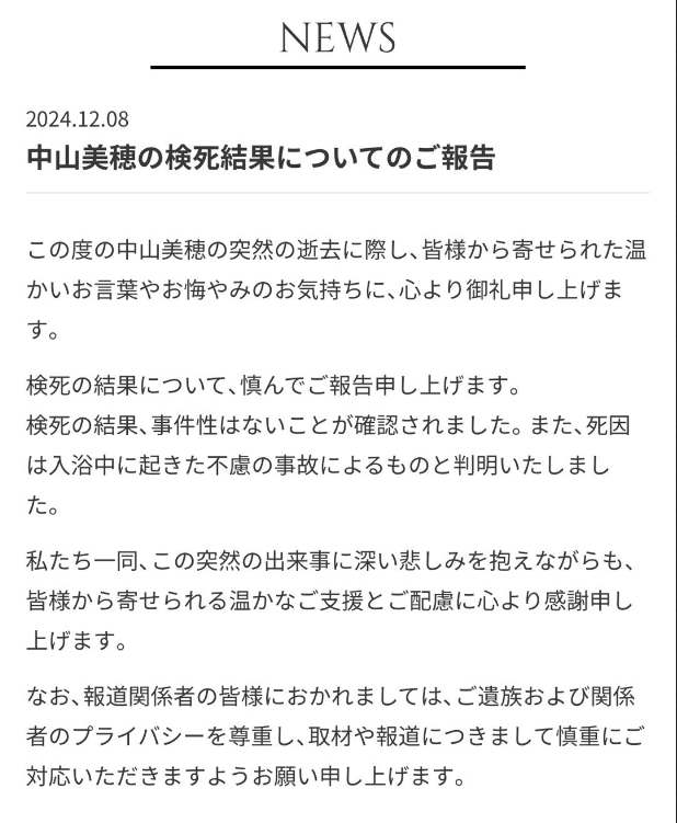 今天中山美穗所属的经纪公司公开了尸检结果。