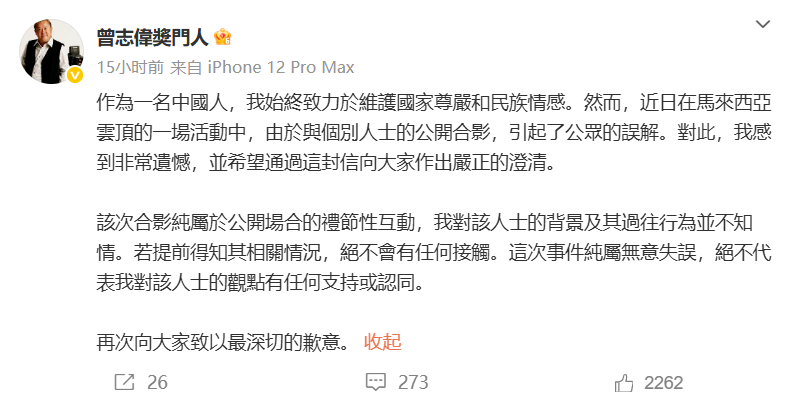 “作为一名中国人,我始终致力于维护国家尊严和民族情感。然而,近日在马来西亚云顶的一场活动中,由于与个别人士的公开合影,引起了公众的误解。对此,我感到非常遗憾,并希望通过这封信向大家作出严正的澄清。”