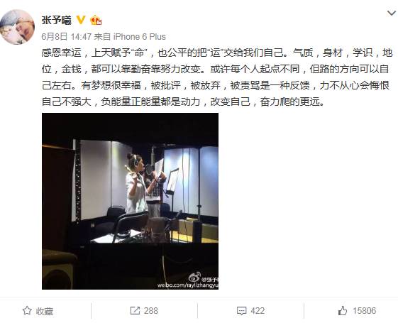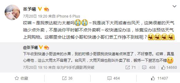因为曾经那个自带流量的光环,现在张予曦仍然备受争议,就拿昨天来说,北京暴雨袭城,她随手发布了一条关心送餐小哥的微博也会受到网友攻击,还不得不再发澄清。小鉴觉得,这或许又是另外一个,欲戴王冠,必承其重的故事。
